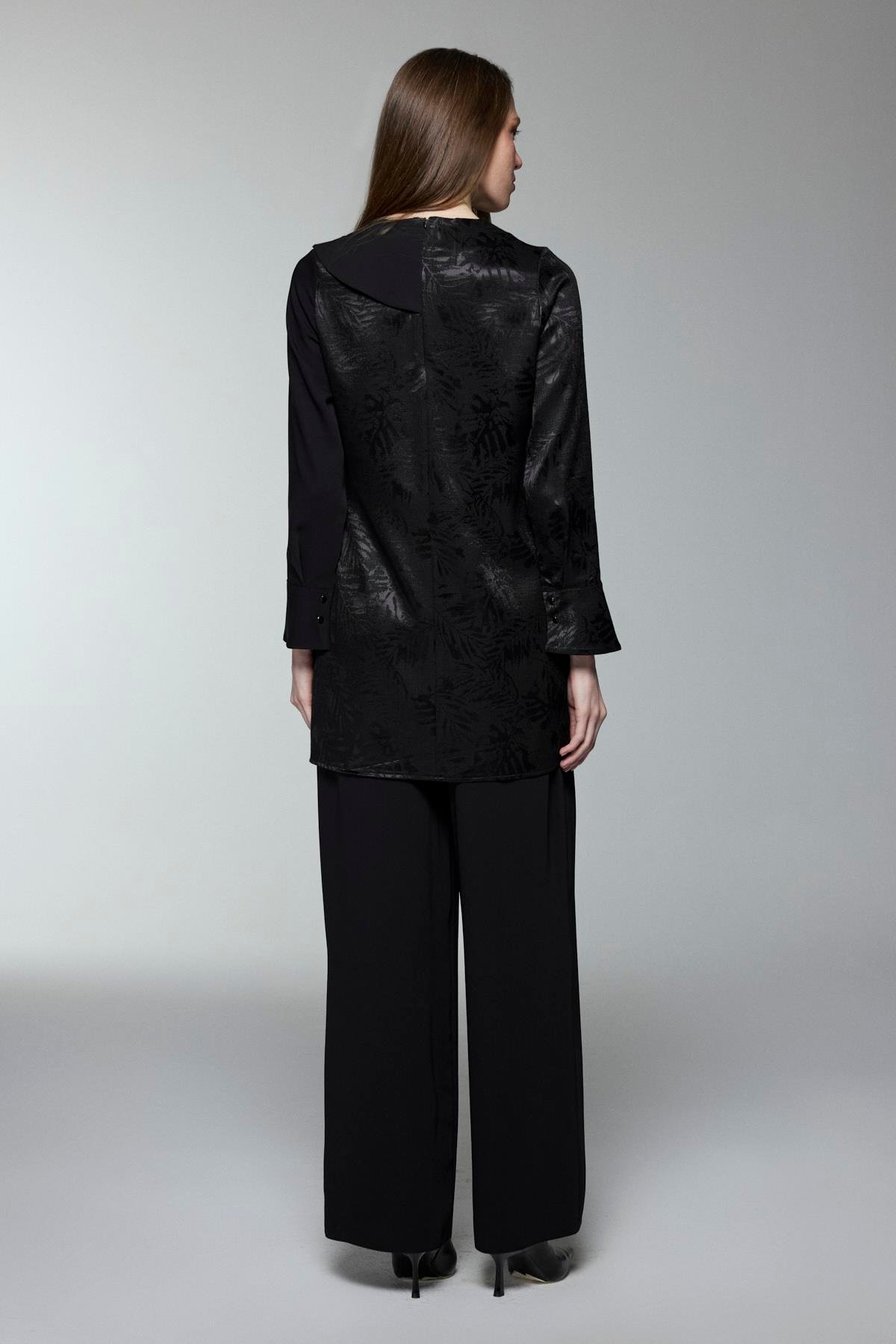 يتميز هذا الطقم الثنائي القطعة بقوامه العصري وتصميمه الأنيق، مع تصميم متدرج غير متماثل وتفاصيل حزام عند الخصر تعزز الأناقة. تقدم البنطلونات الواسعة الراحة، بينما تضيف تفاصيل الأكمام المموجة على القطعة العلوية لمسة راقية للتصميم.