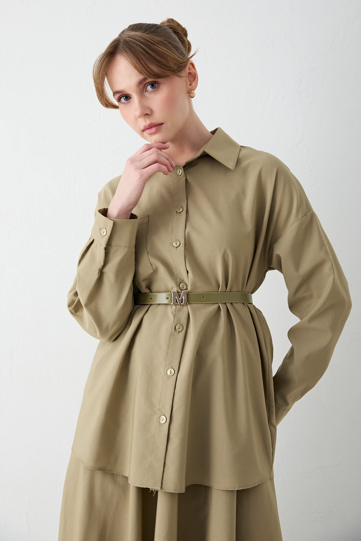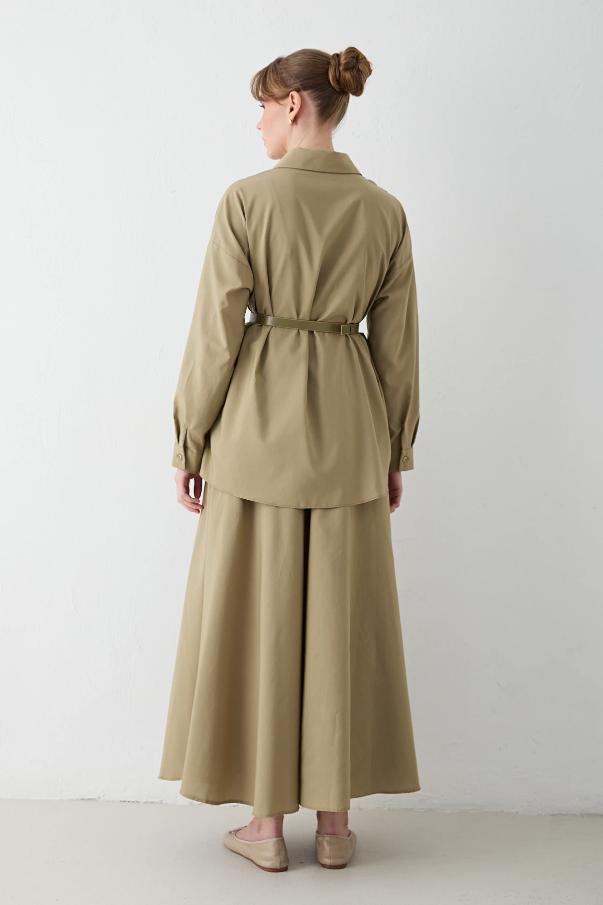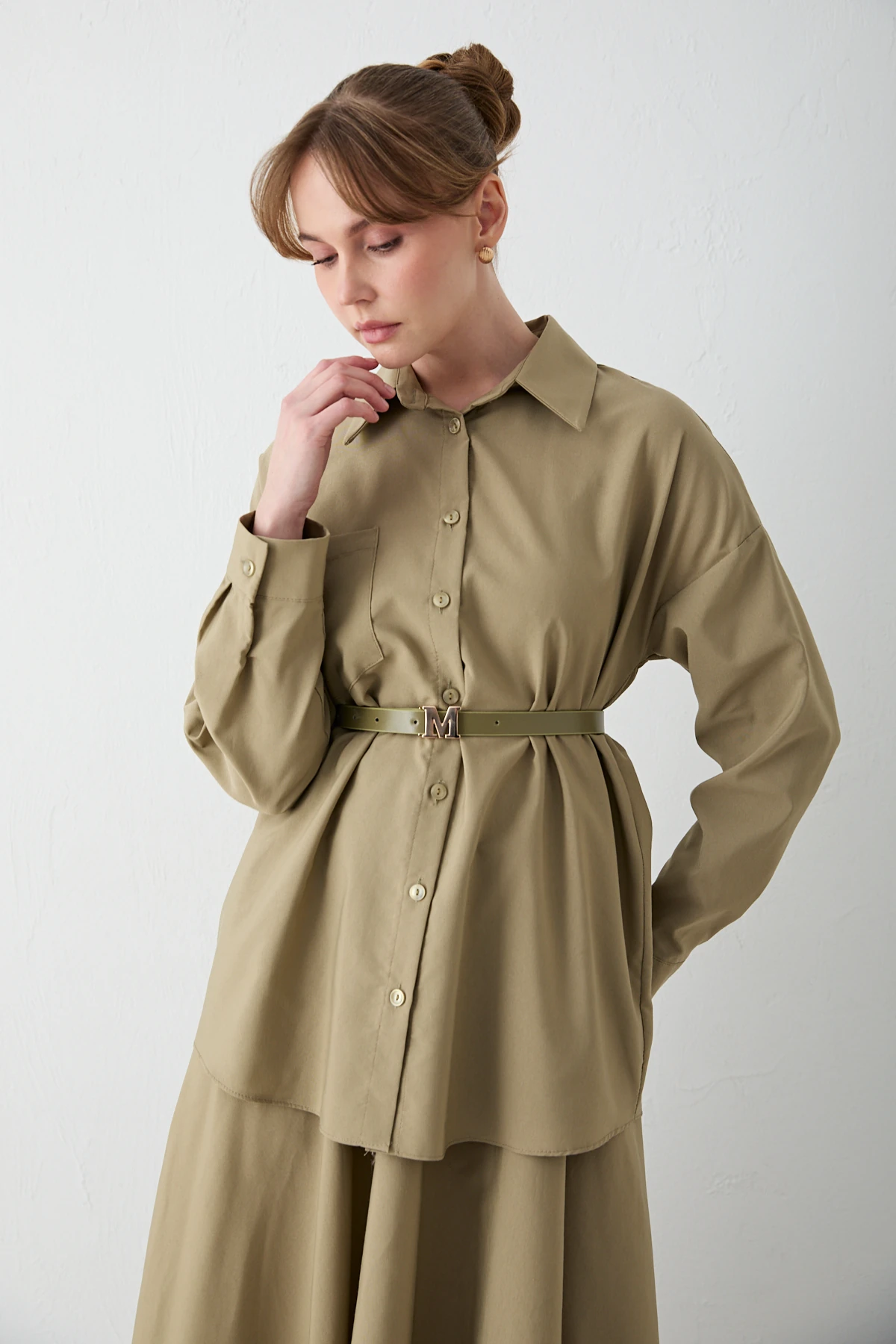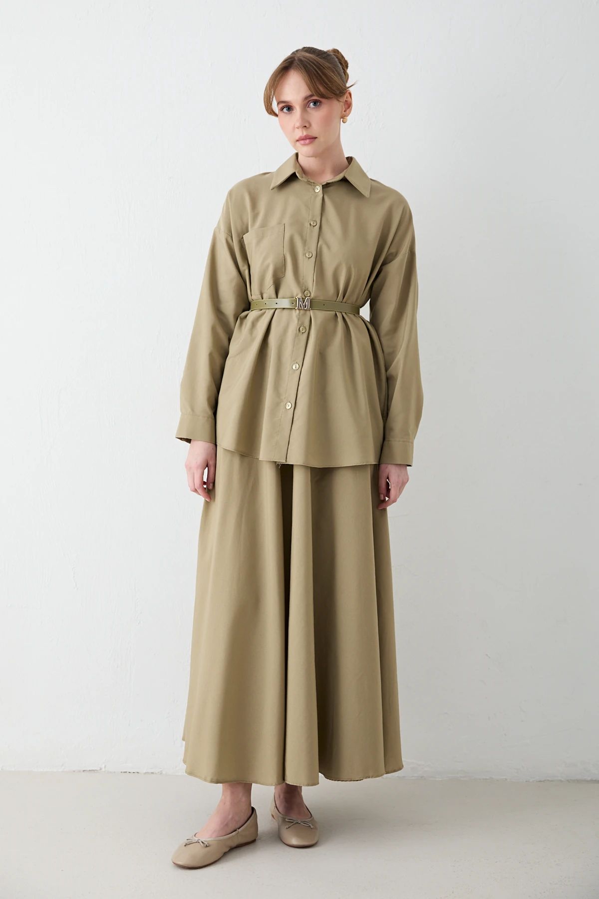 يقدم هذا الطقم الكلاسيكي المريح تصميمًا ذو ياقة قميص وأزرار أمامية، مكتملًا بتفاصيل خط الكتف المنخفض وجيب الصدر الأيمن. يتكيف الحزام القابل للإزالة مع شكل جسمك، بينما تضمن خصر التنورة المطاطي والجيوب الجانبية الراحة للارتداء اليومي. يجعل قماش البوبلين المقاوم والخفيف هذا الطقم أنيقًا وعمليًا في نفس الوقت.