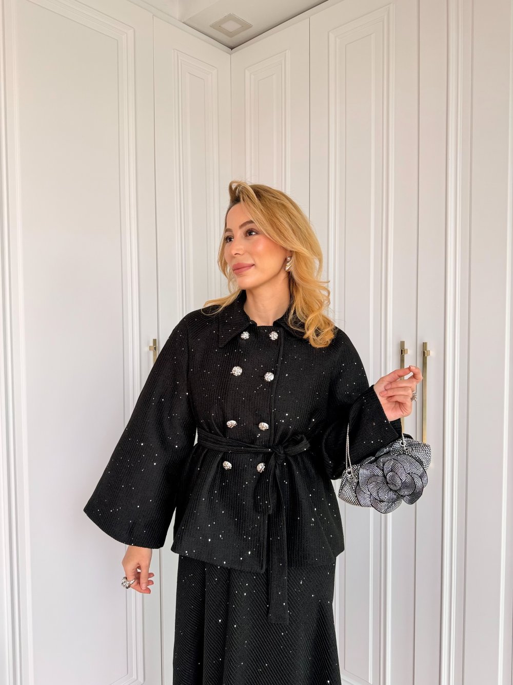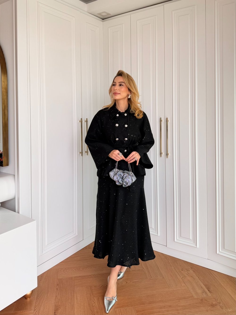هذا الطقم مصنوع من قماش مخمل عالي الجودة مغطى بالترتر. يتميز السترة بإغلاق كامل بالأزرار وأكمام واسعة وحزام قابل للإزالة وتصميم كتف منخفض. تحتوي التنورة على خصر مرن وحاشية مرنة لملاءمة مريحة. تفاصيل الترتر تزين القماش بالكامل. القياسات: طول السترة 69 سم، محيط الصدر 55 سم؛ طول التنورة 95 سم، محيط الخصر 32 سم.