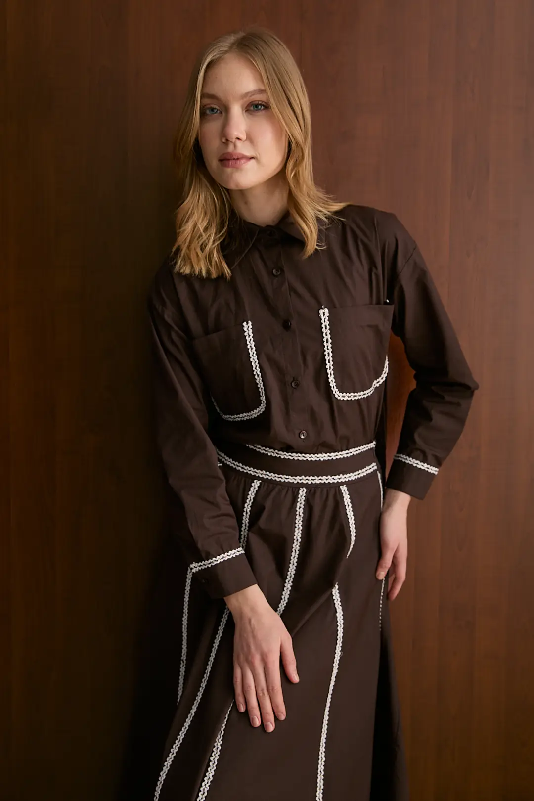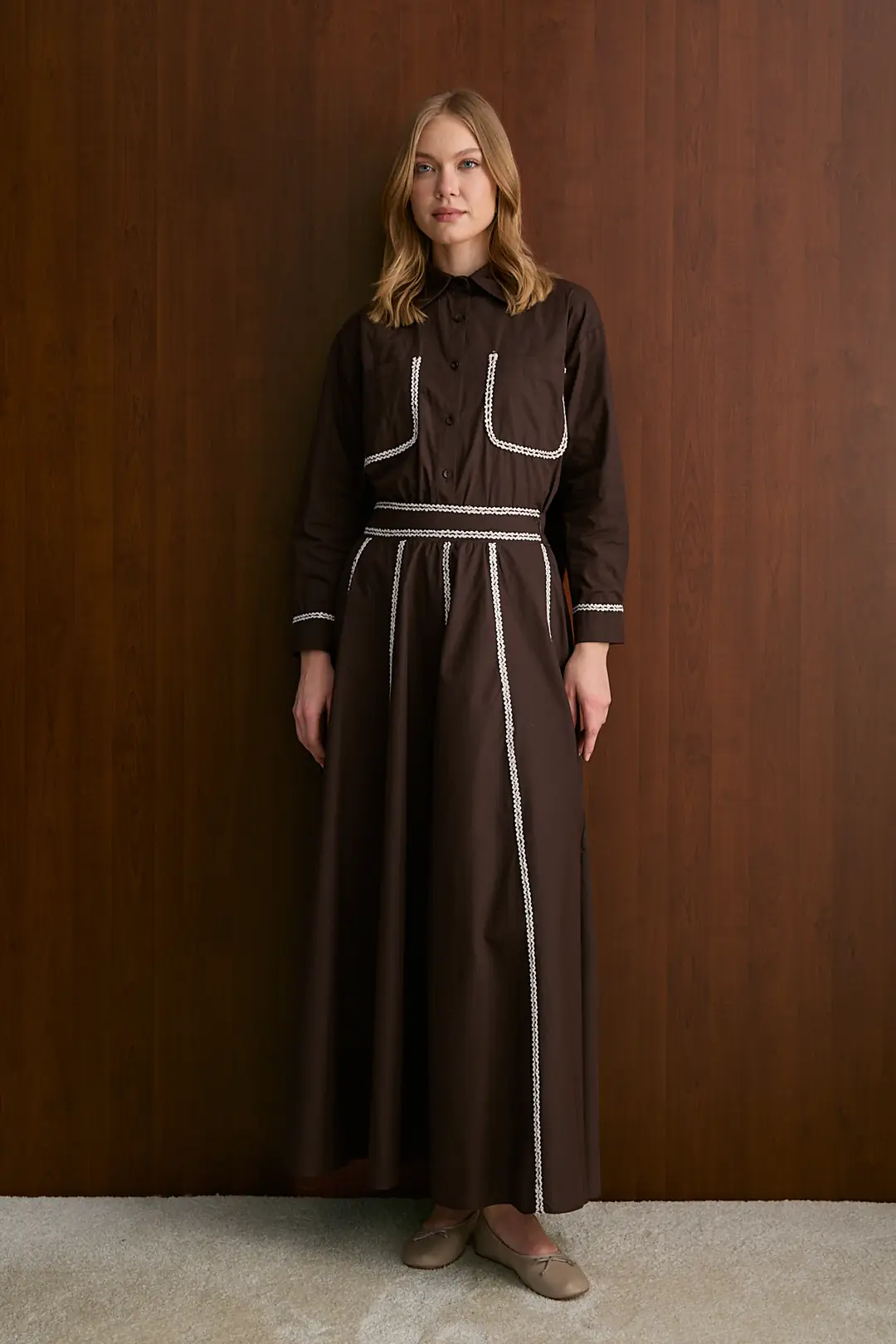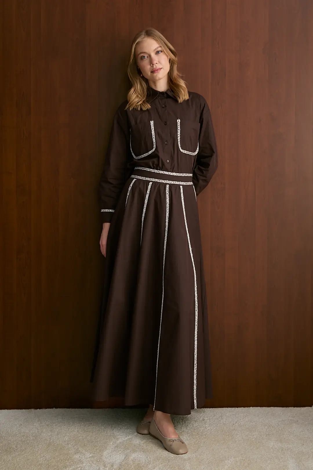 يتميز هذا الطقم الكلاسيكي بصف ياقة القميص وتصميم الأزرار الأمامية، مكتملاً بتفاصيل الجيب الصدري وأزرار الأكمام. توفر الشقوق الجانبية بطول 27 سم عند طرف التنورة حرية الحركة، بينما تقدم بنية الخصر المرنة (مسطحة من الأمام) وتفصيل الشق الجانبي الأيسر بطول 18 سم راحة في الاستخدام. يُشكل قماش البوبلين الخفيف والمتين مظهراً مثالياً للأناقة اليومية.