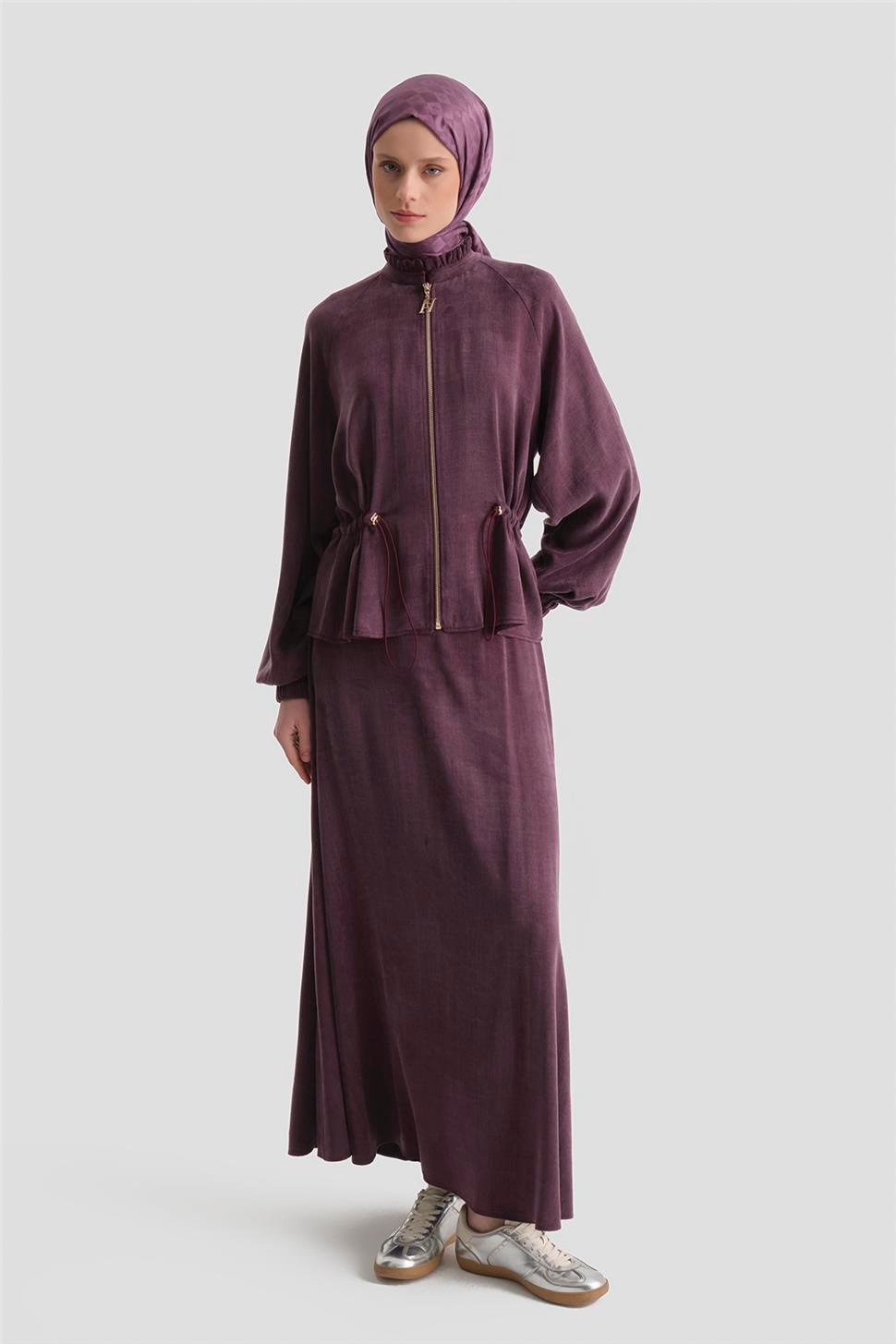 يجمع هذا الطقم بين الأناقة والخطوط العصرية من خلال شكله المتدفق وملمسه الناعم، ليقدم وقفة راقية بتصميمه المتوازن. يُبرز تصميم الجاكيت القابل للتعديل من منطقة الخصر نسب الجسم بدقة، بينما يضيف تصميم التنورة الطويلة وحدة متدفقة للمظهر. تصميم خالد لمن يبحثون عن أناقة سلسة من الأناقة اليومية إلى التوليفات الأكثر تميزًا.