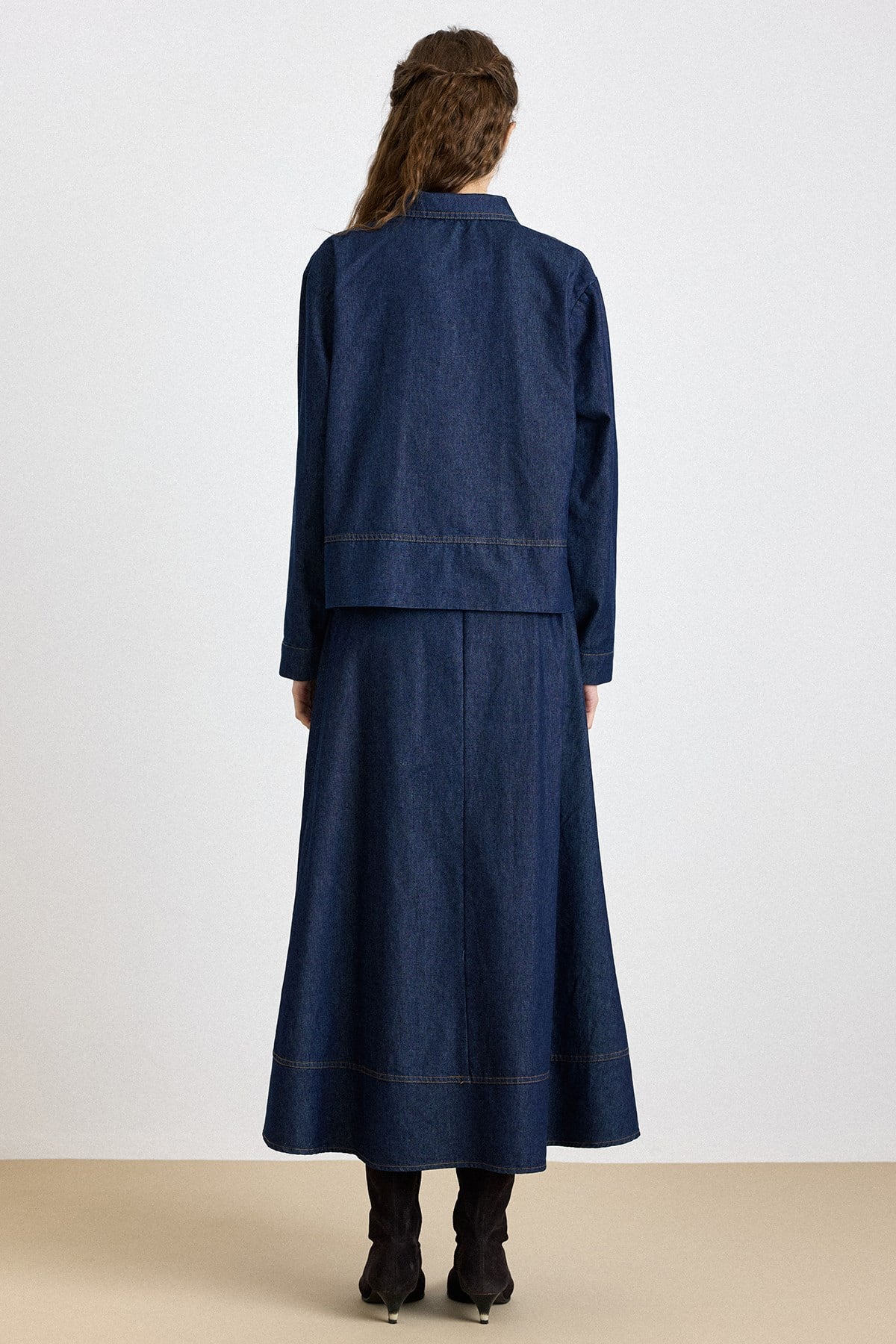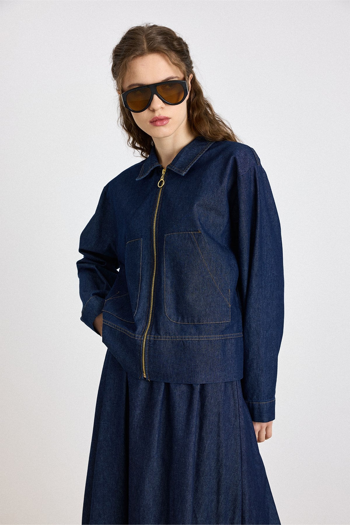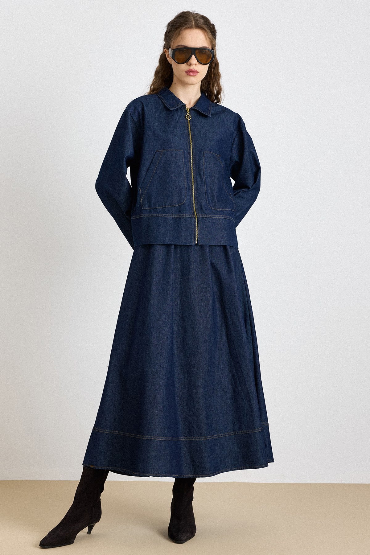 طقم الجينز من سترة وتنورة بإغلاق سحاب أزرق بحري 9447-TK