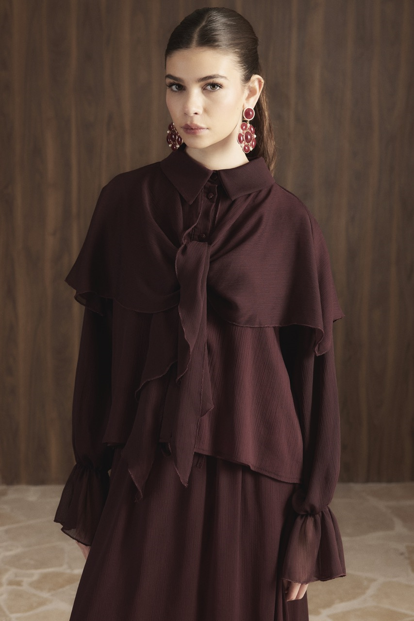طقم الشيفون ذو الياقة الملفوفة بالوشاح – لون كستنائي