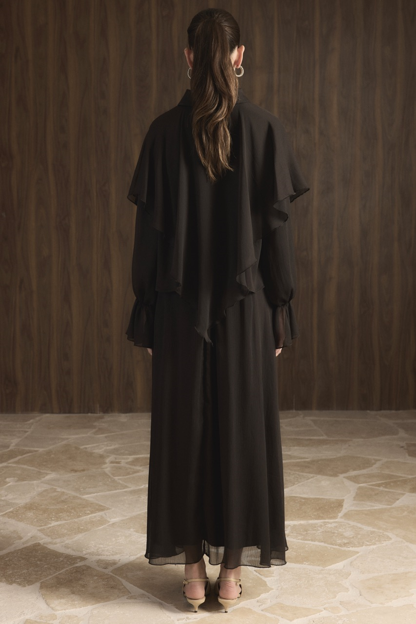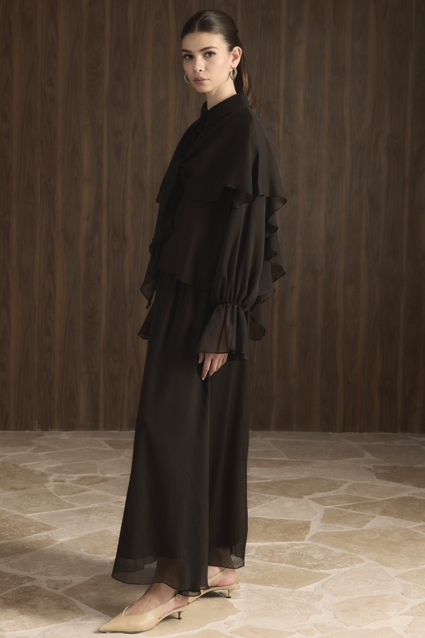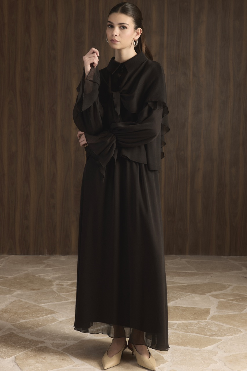 طقم شيفون أنيق بتصميم ياقة ملفوفة عصرية بلون قهوة مرّة راقي. مثالي لابتكار إطلالة أنيقة وعصرية.