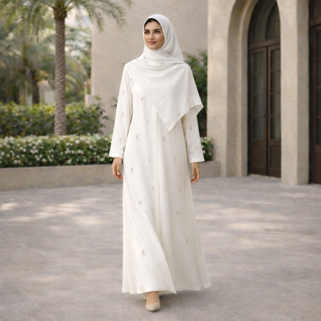 طقم العباءة والوشاح الأبيض بتصميم أزهار الأقحوان واللؤلؤ