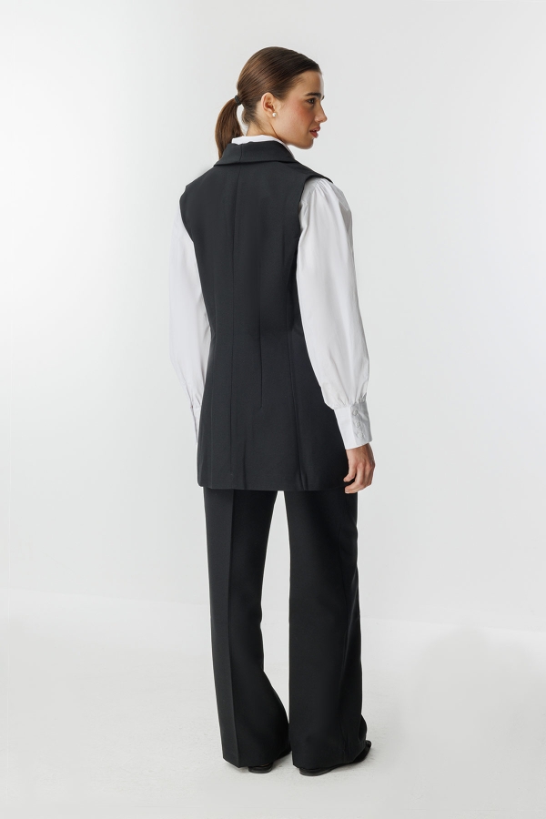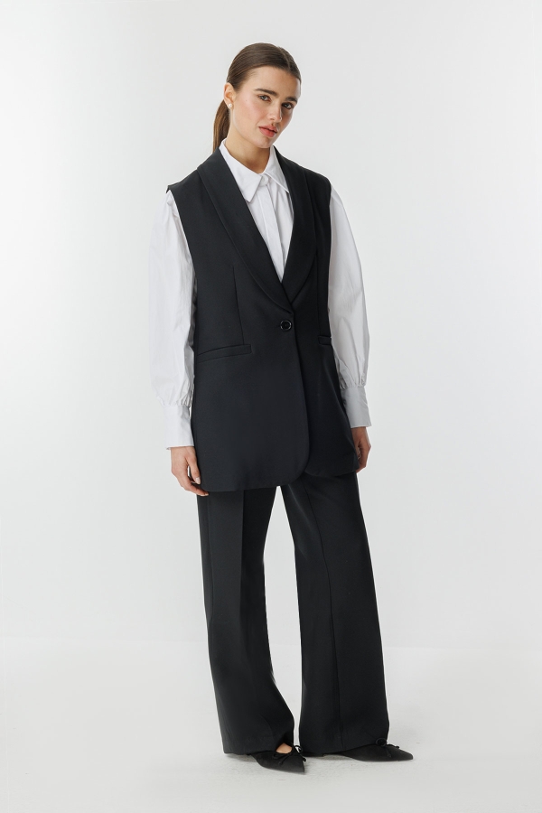 طقم السترة المزدوج هذا بتفاصيله الأنيقة هو خيار متعدد الاستخدامات يمكن استخدامه في العديد من المناسبات، من الدعوات الخاصة إلى الأناقة اليومية. إنه الخيار المثالي للسيدات اللواتي يرغبن في الظهور بأناقة مع الشعور بالراحة. باهتمامه الدقيق بالتفاصيل ووقفته الراقية، يصبح الخيار الأمثل لمن يرغبن في الظهور بأناقة في كل مكان. هذا الطقم مع السترة، الذي يمكن الانتقال به بسهولة من النهار إلى الليل، يصبح قطعة المنقذ في خزانة ملابسك.