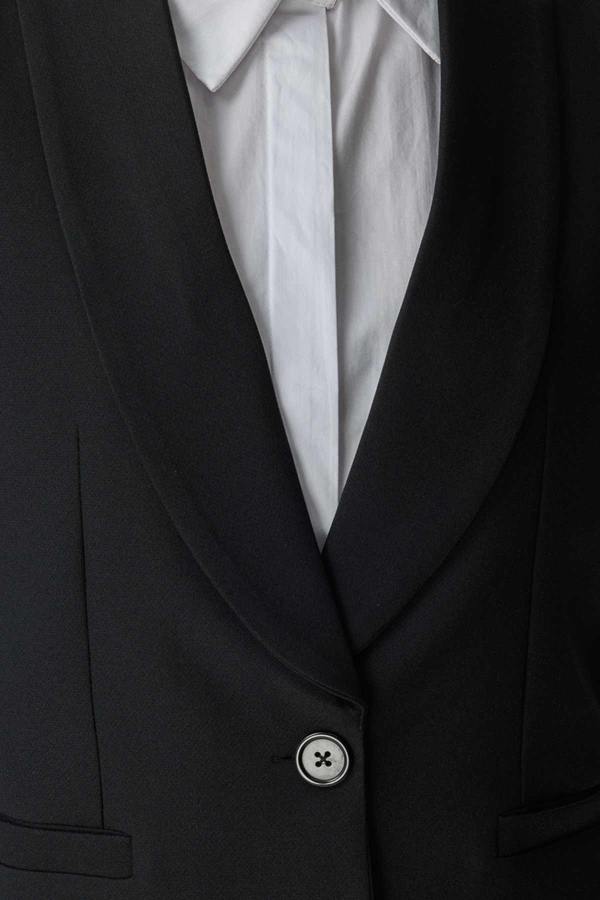 طقم الكريب الأسود بقلنسوة الياقة والسترة