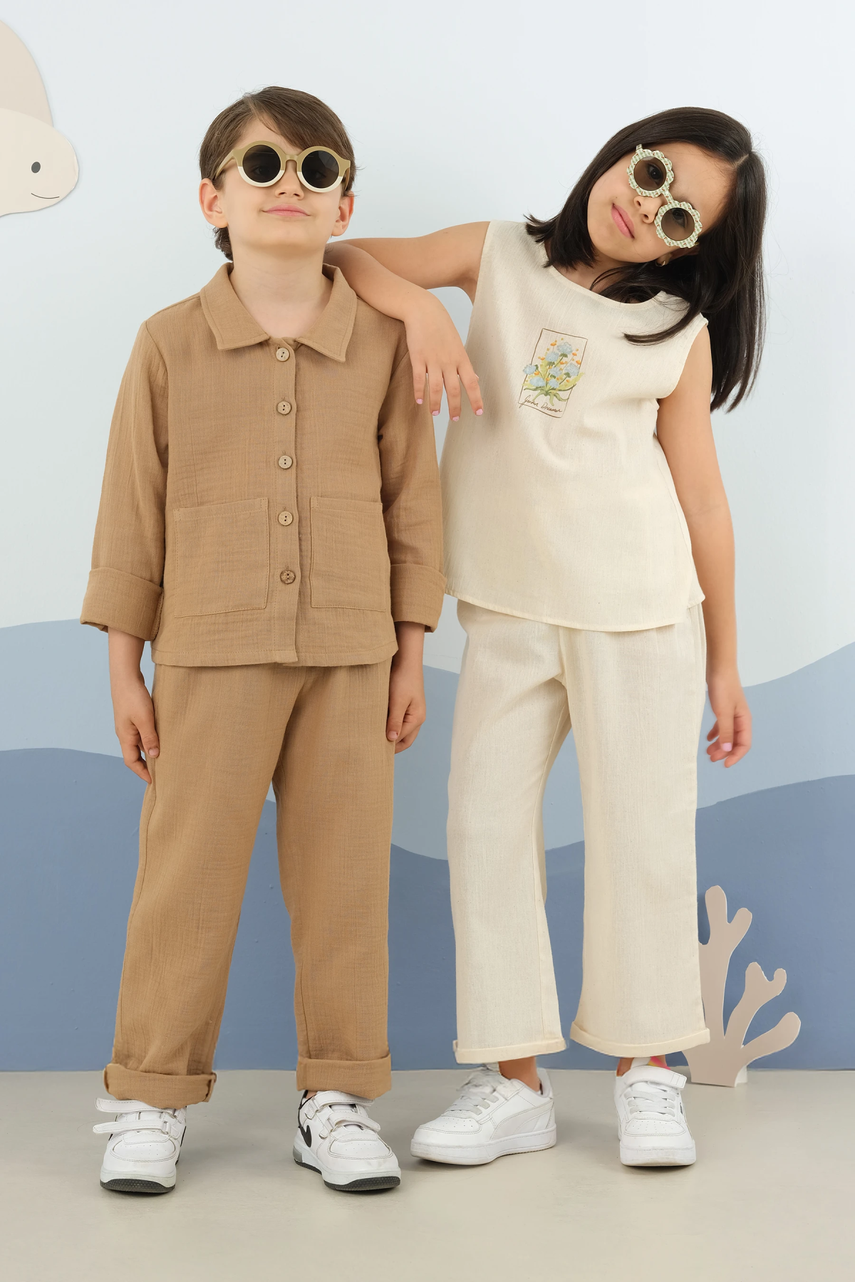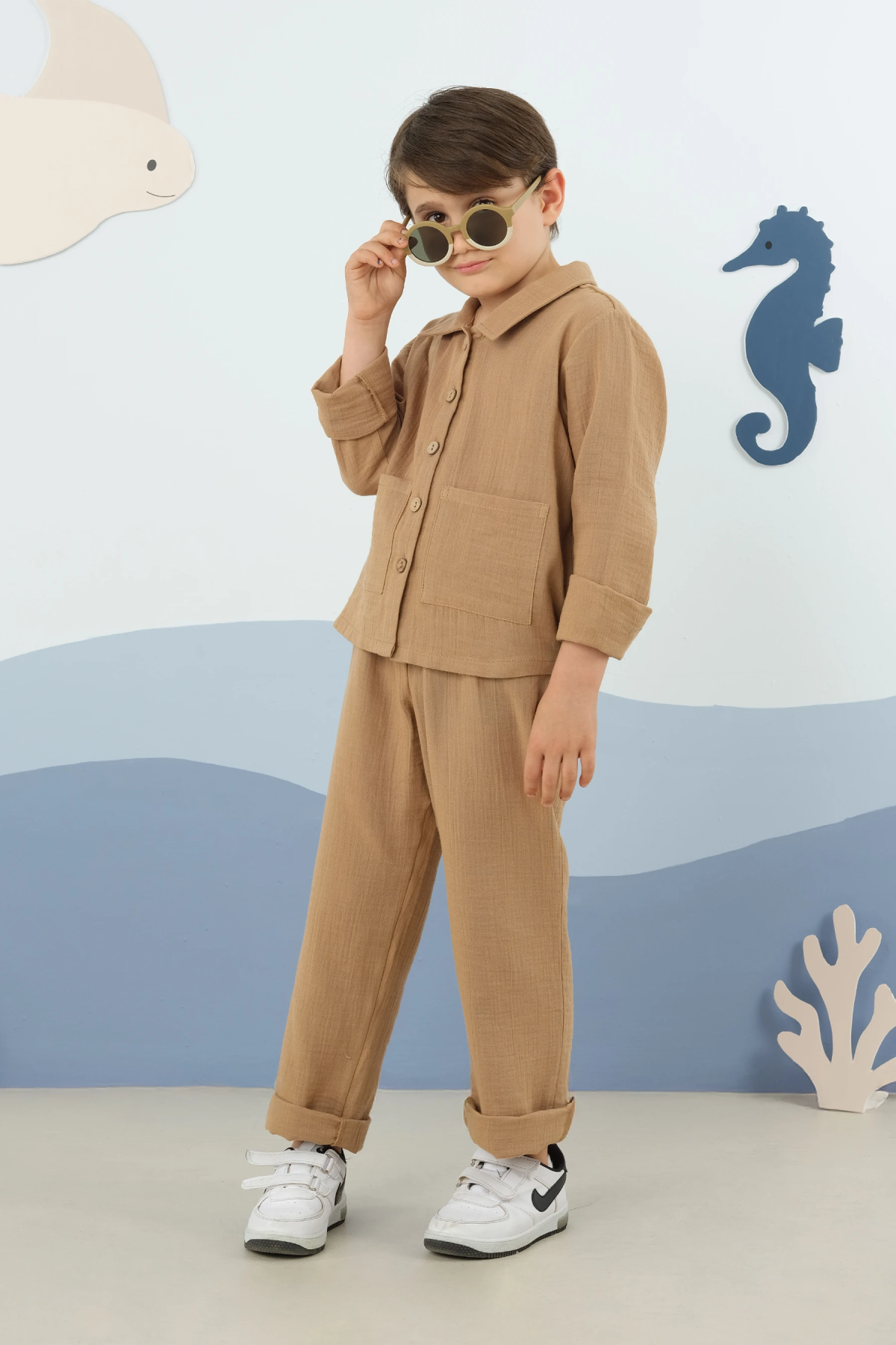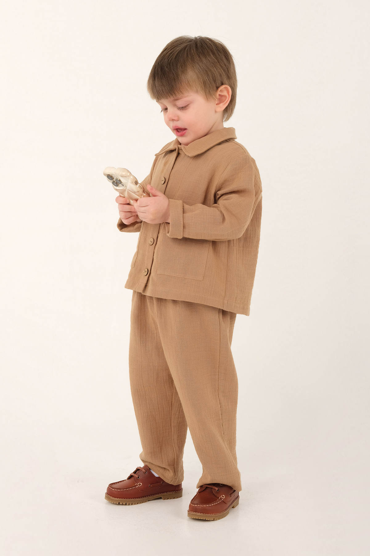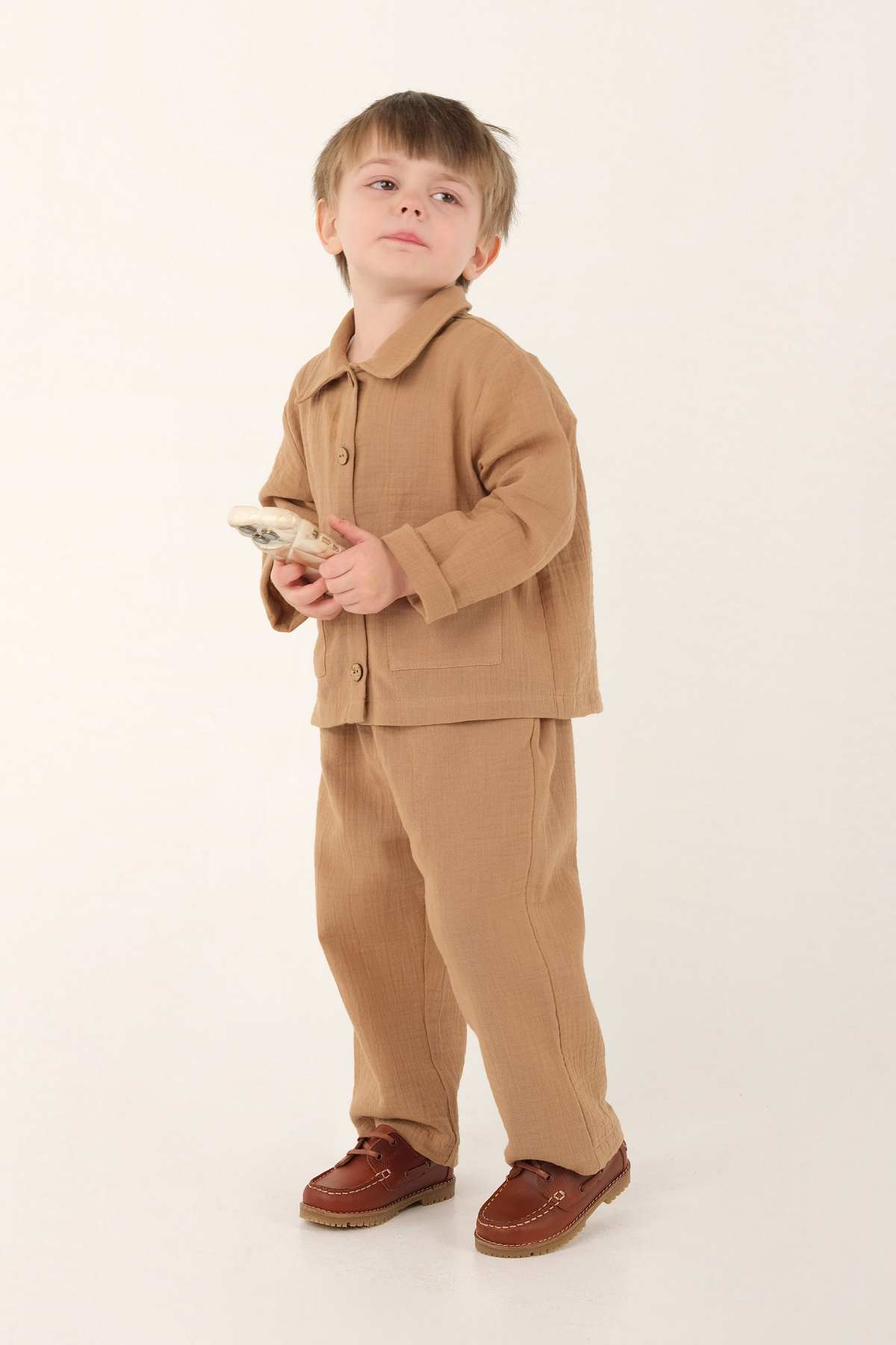 طقم مصنوع من قماش الموسلين القطني بنسبة 100%. قميص مزود بياقة وأزرار أمامية وجيبين. بنطال مزود بخصر مطاطي وجيوب جانبية. منتجاتنا تتميز بتصميمات واسعة. للحصول على تناسب مشابه للعرض، اختر الفئة العمرية المناسبة تماماً. من 1 إلى 2 سنة: طول القميص من الخلف في المنتصف: 36 سم، طول البنطال: 50 سم. من 2 إلى 3 سنوات: طول القميص من الخلف في المنتصف: 37 سم، طول البنطال: 54 سم. من 3 إلى 4 سنوات: طول القميص من الخلف في المنتصف: 38 سم، طول البنطال: 58 سم. من 4 إلى 5 سنوات: طول القميص من الخلف في المنتصف: 40 سم، طول البنطال: 62 سم. من 5 إلى 6 سنوات: طول القميص من الخلف في المنتصف: 41 سم، طول البنطال: 66 سم. من 7 إلى 8 سنوات: طول القميص من الخلف في المنتصف: 44 سم، طول البنطال: 74 سم. العارضة تبلغ من العمر 3 سنوات. المقاس المستخدم هو 3-4 سنوات.