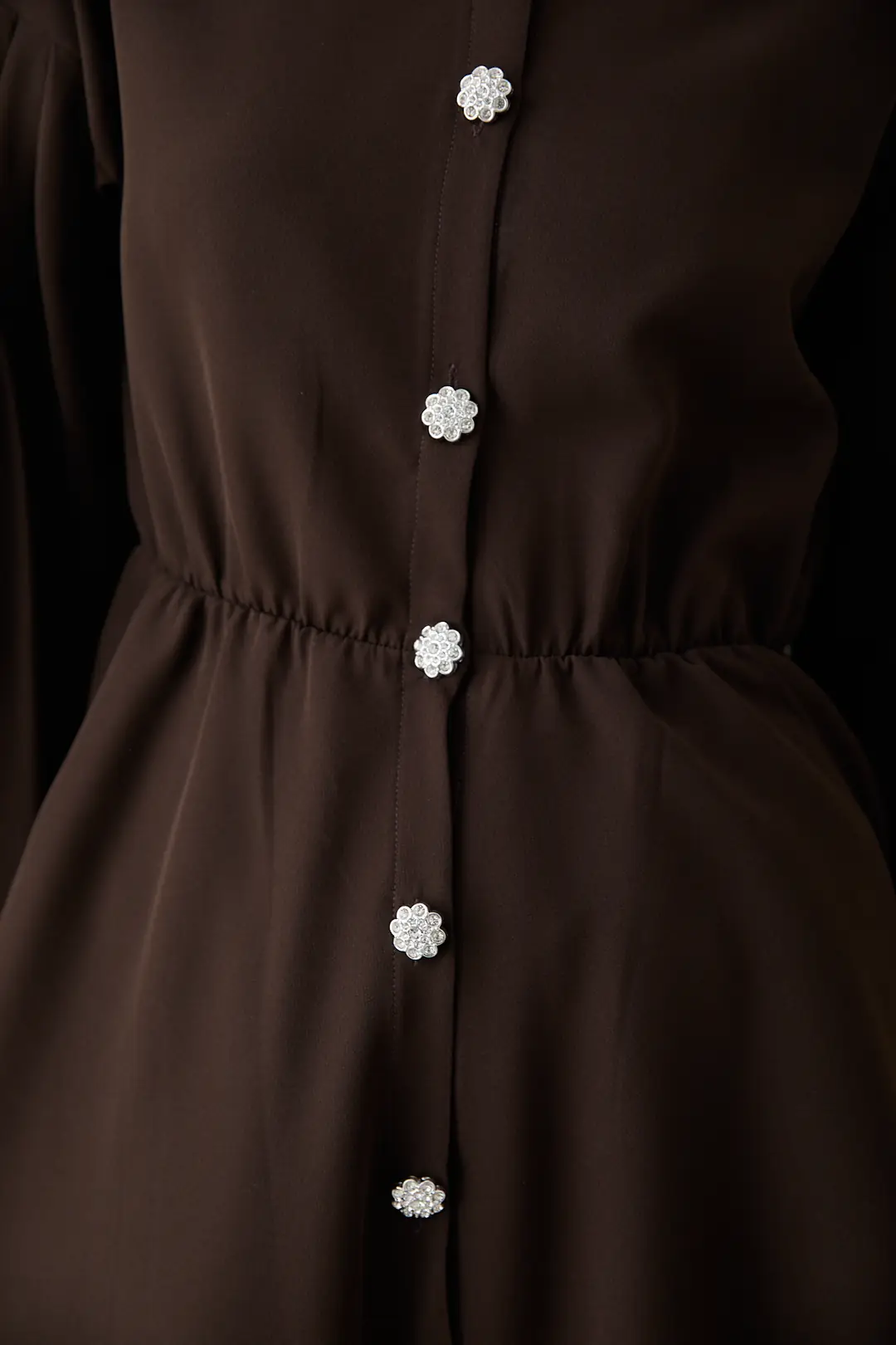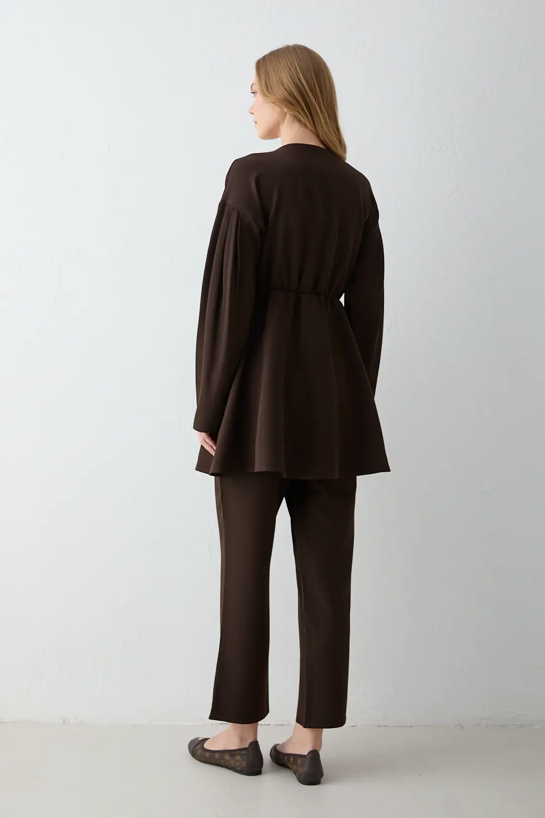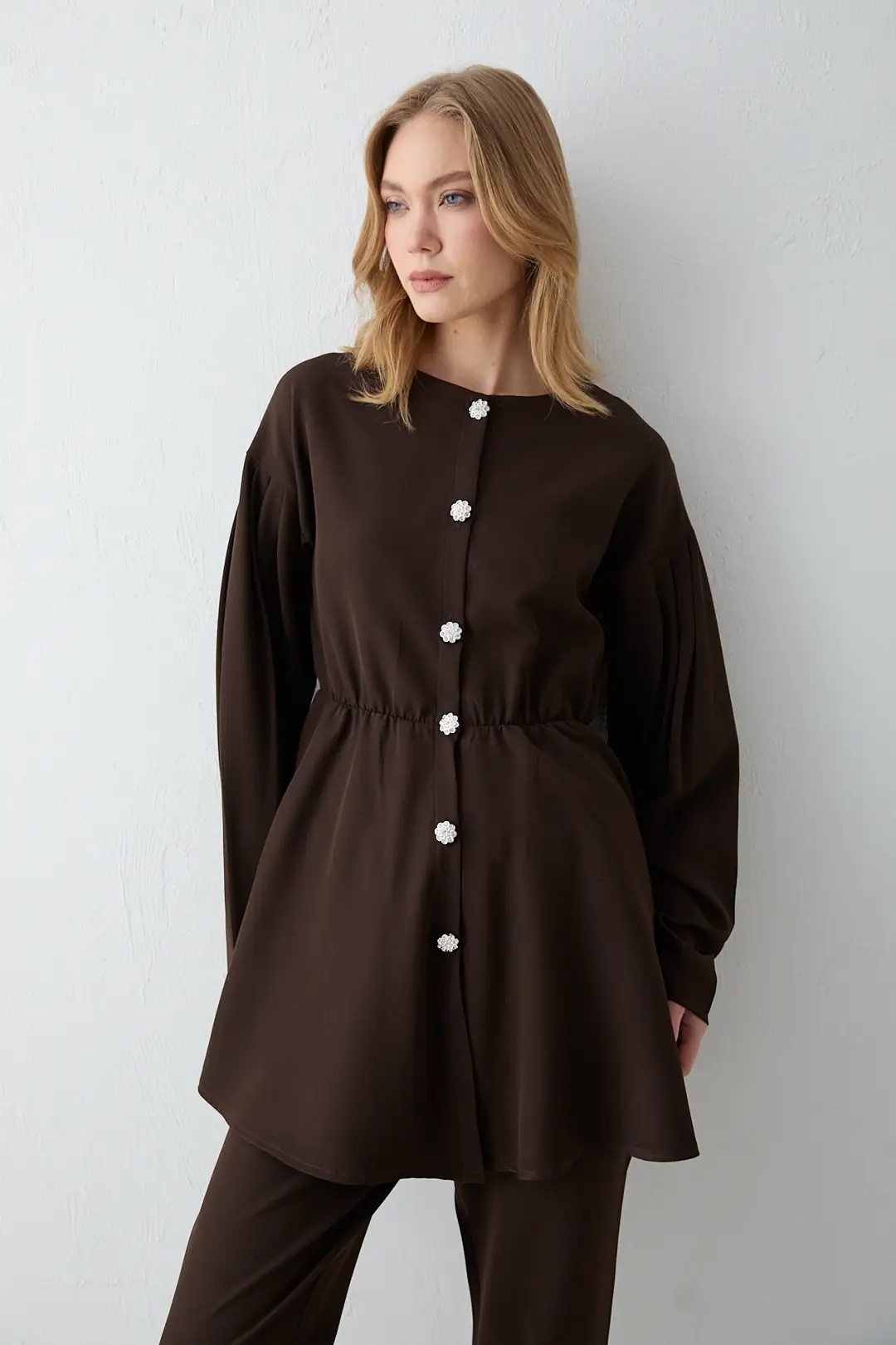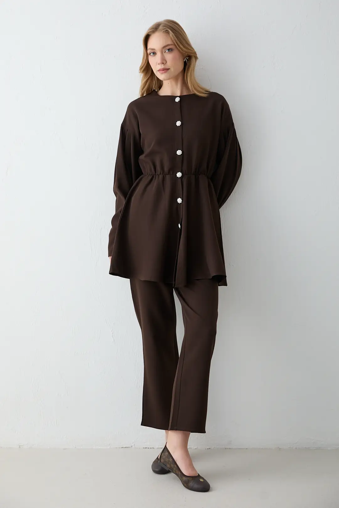 يقدم هذا الطقم الأنيق تصميمًا برقبة مستديرة وأزرار حجرية في المقدمة، مما يمنحه مظهرًا أنيقًا. يوفر الخصر المطاطي والحزام القابل للتعديل ارتداءً مريحًا، بينما يعزز خصر البنطال المطاطي الراحة. يشكل الجزء العلوي والسفلي معًا خطًا أنيقًا وعصريًا. بفضل قماش الكريب، يجمع الطقم بين الأناقة والوظيفية.