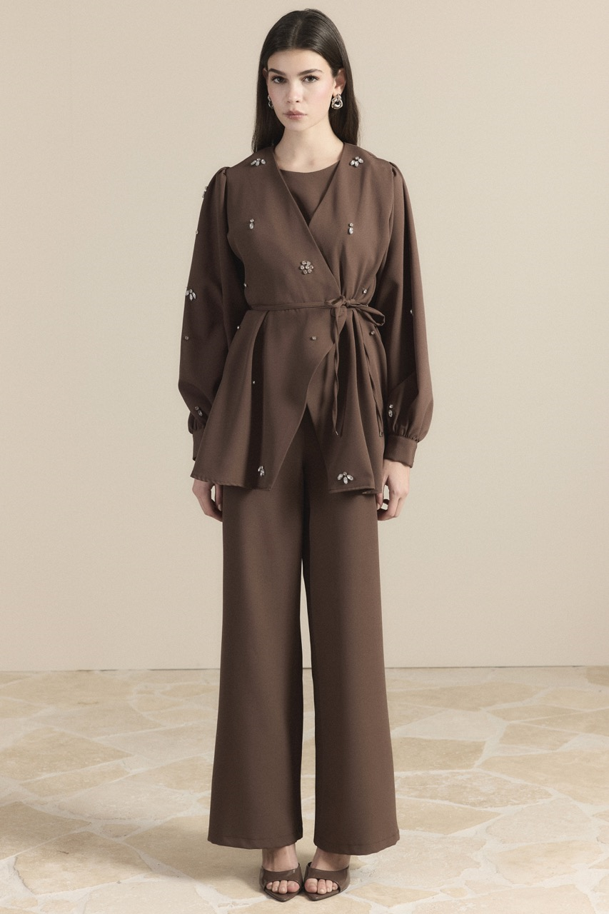 طقم بدلة مزدوجة الصدر مرصع بالحجارة – لون القهوة
