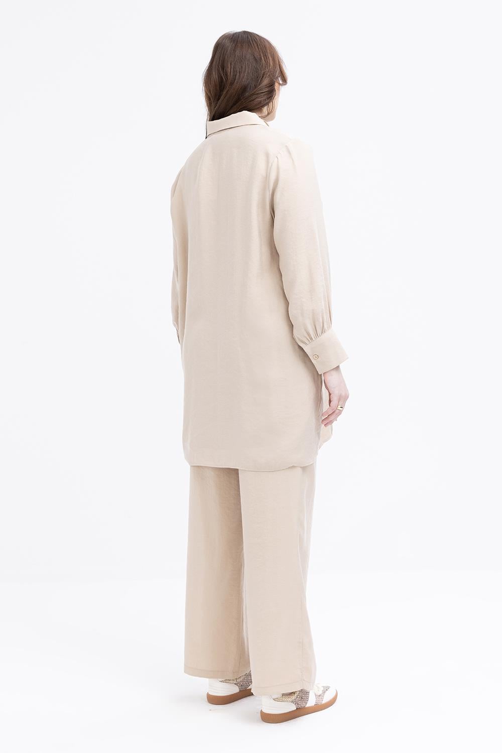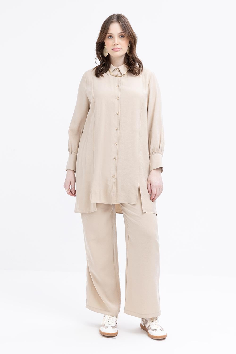 طقم بنطال من قماش المودال بتفاصيل شق بلون البيج