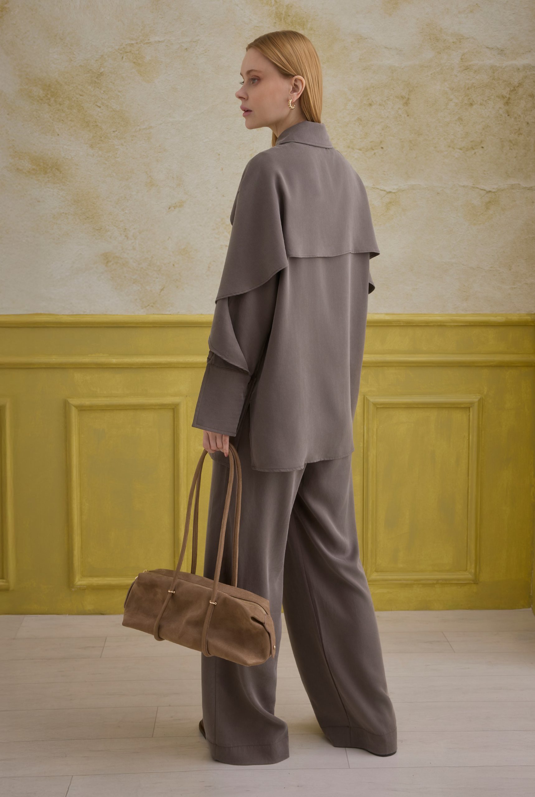 تضيف تفاصيل التمويج حركةً، مما يخلق مظهراً ديناميكياً ومميزاً. توفر التفاصيل المرنة في ظهر البنطلون راحة إضافية وحرية في الحركة للارتداء اليومي. مع انسيابه الأنيق الذي يتدلى بجمال على الجسم، يمكن تنسيق هذا الطقم بسهولة للإطلالات اليومية والإطلالات الحضرية الراقية.