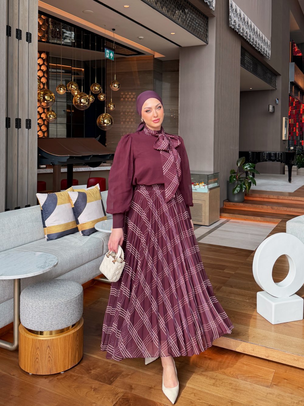 العلامات: skirt set, women's fashion, بورغندي, شيفون, مربعات, مطوي