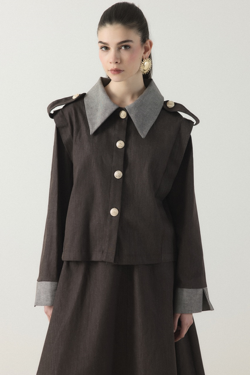 طقم تنورة الجينز باللون البني مع تفاصيل الكفة المعكوسة