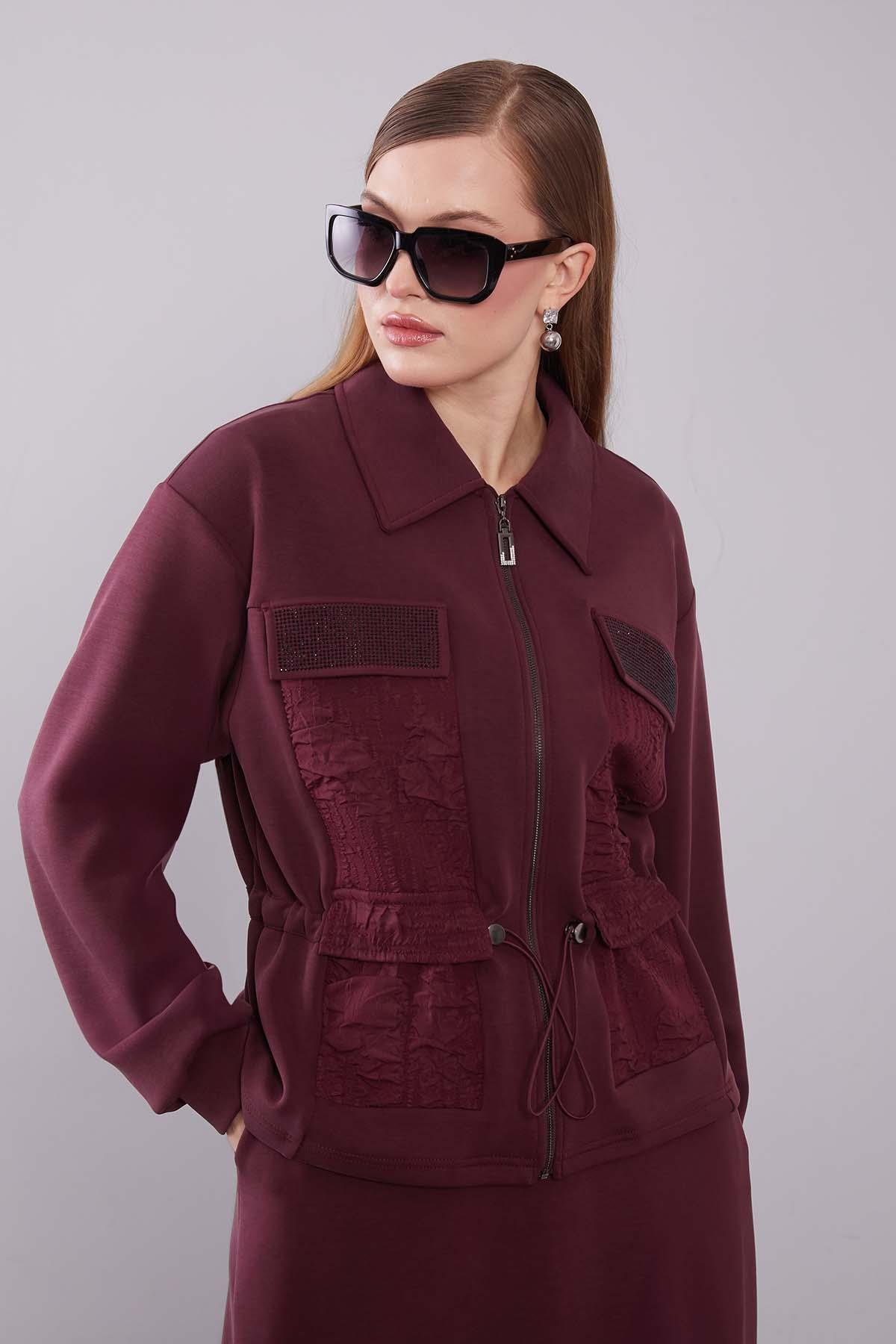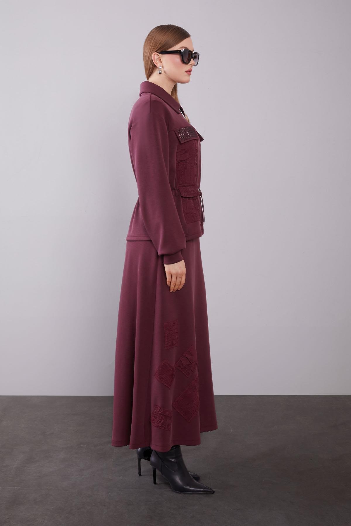 طقم تنورة بتفاصيل الترقيع والتجعد باللون العنابي
