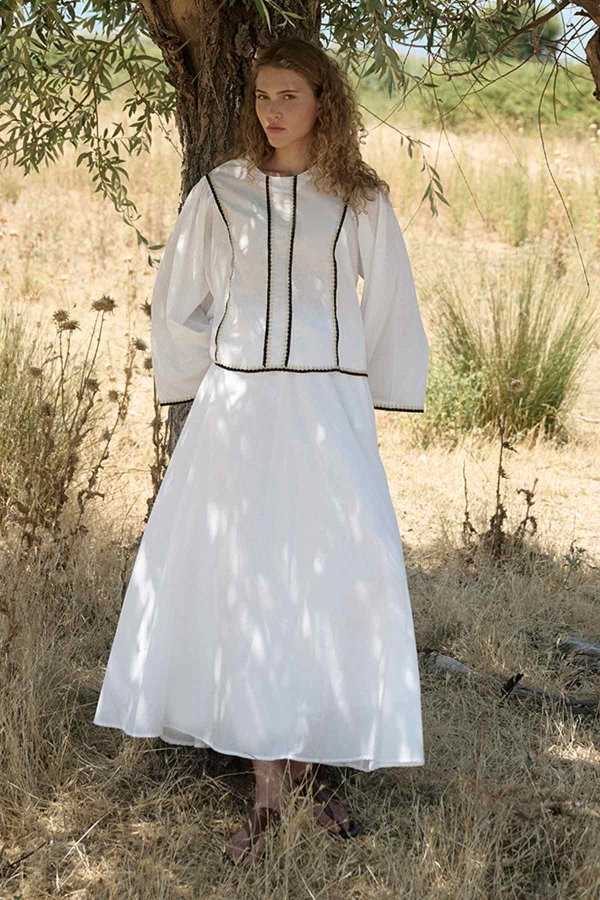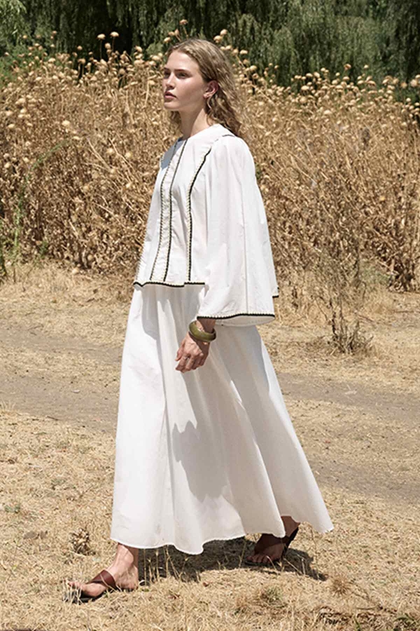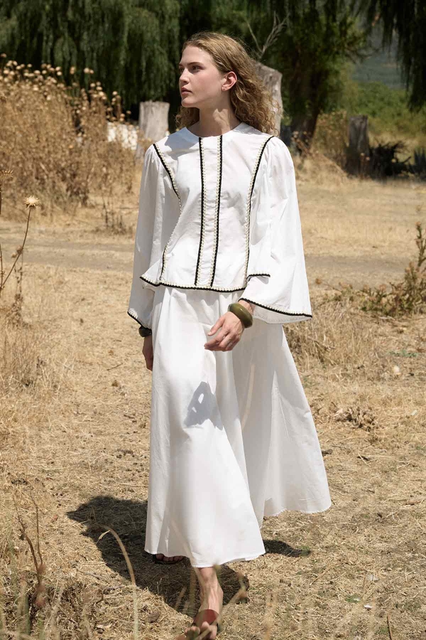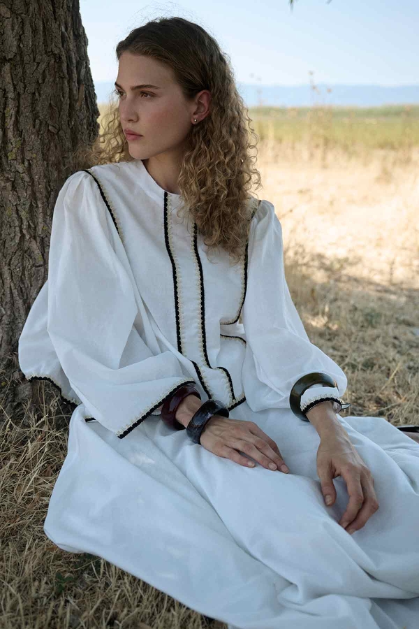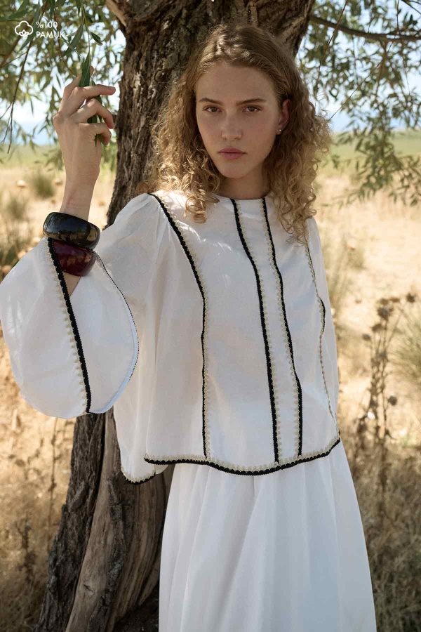 مصنوع من قماش فويل قطني خاص 100%، ياقة مستديرة، سحاب خلفي، أكمام على الطراز الإسباني، تفاصيل شريطية، تنورة بخصر مطاطي، رباط قابل للتعديل، تفاصيل جيوب، مبطن بنفس القماش، قصة عادية، طقم تنورة من الفويل القطني.