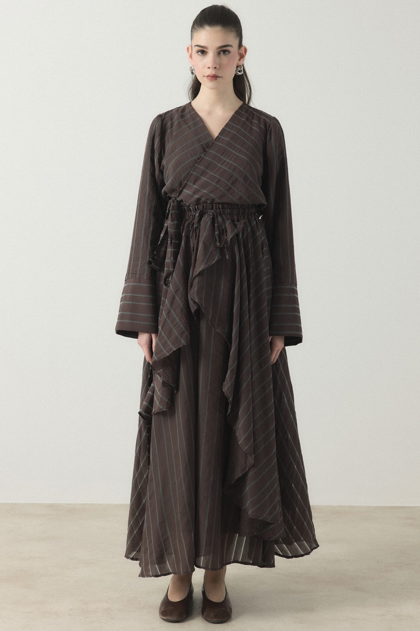 طقم تنورة مخططة مطوي – لون القهوة المرّة