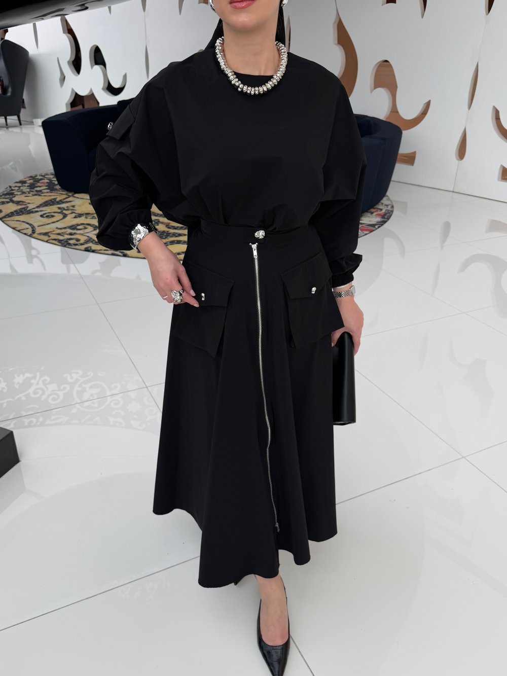 هذا الطقم مصنوع من قماش المظلات من الدرجة الأولى. يتميز البلوزة بتصميم على شكل جيوب. الأكمام مزودة بأربطة مرنة عند الأطراف. الطقم مزود بقلب دراجة. يتميز بتصميم منخفض عند الكتفين. ظهر القلب مزود بسحاب. التنورة مزودة بتفاصيل سحاب على طولها بالكامل. تحتوي التنورة على تفاصيل جيوب. الخصر مزود بإغلاق بأزرار وظهر مرن. طول البلوزة: 67 سم. طول التنورة: 93 سم. مقاس خصر التنورة: 34 سم.