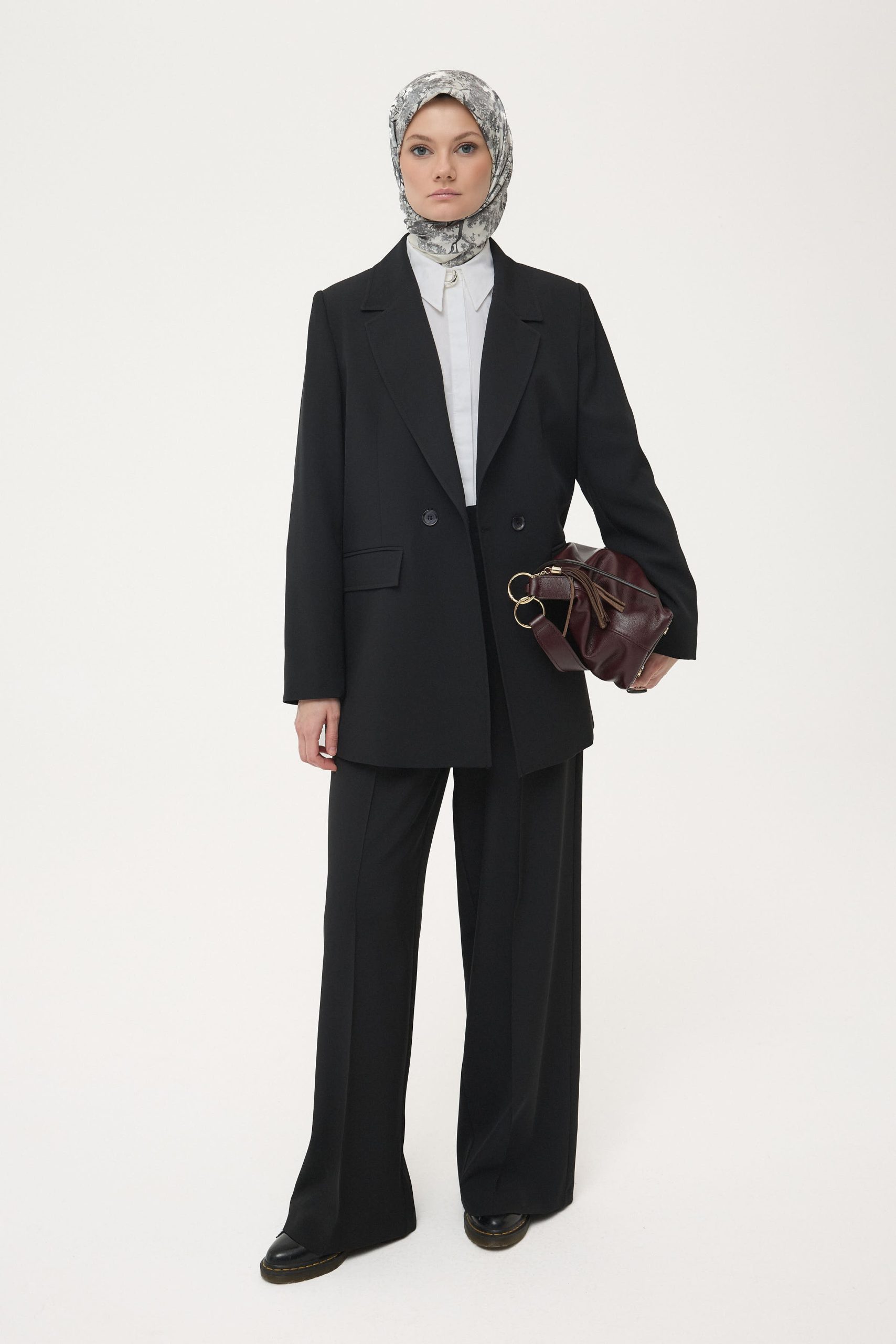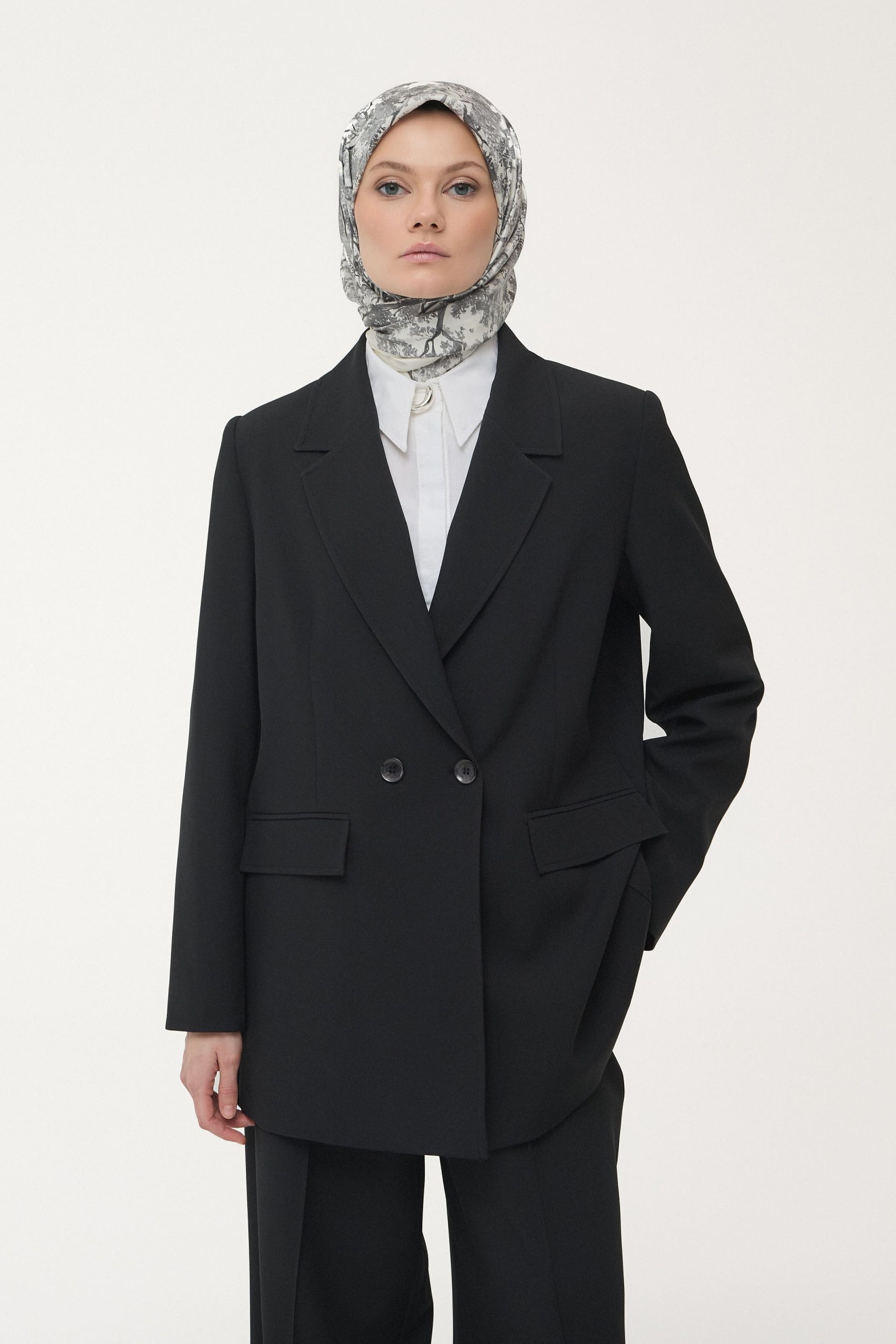 طقم جاكيت وسراويل بتفاصيل جيوب – أسود