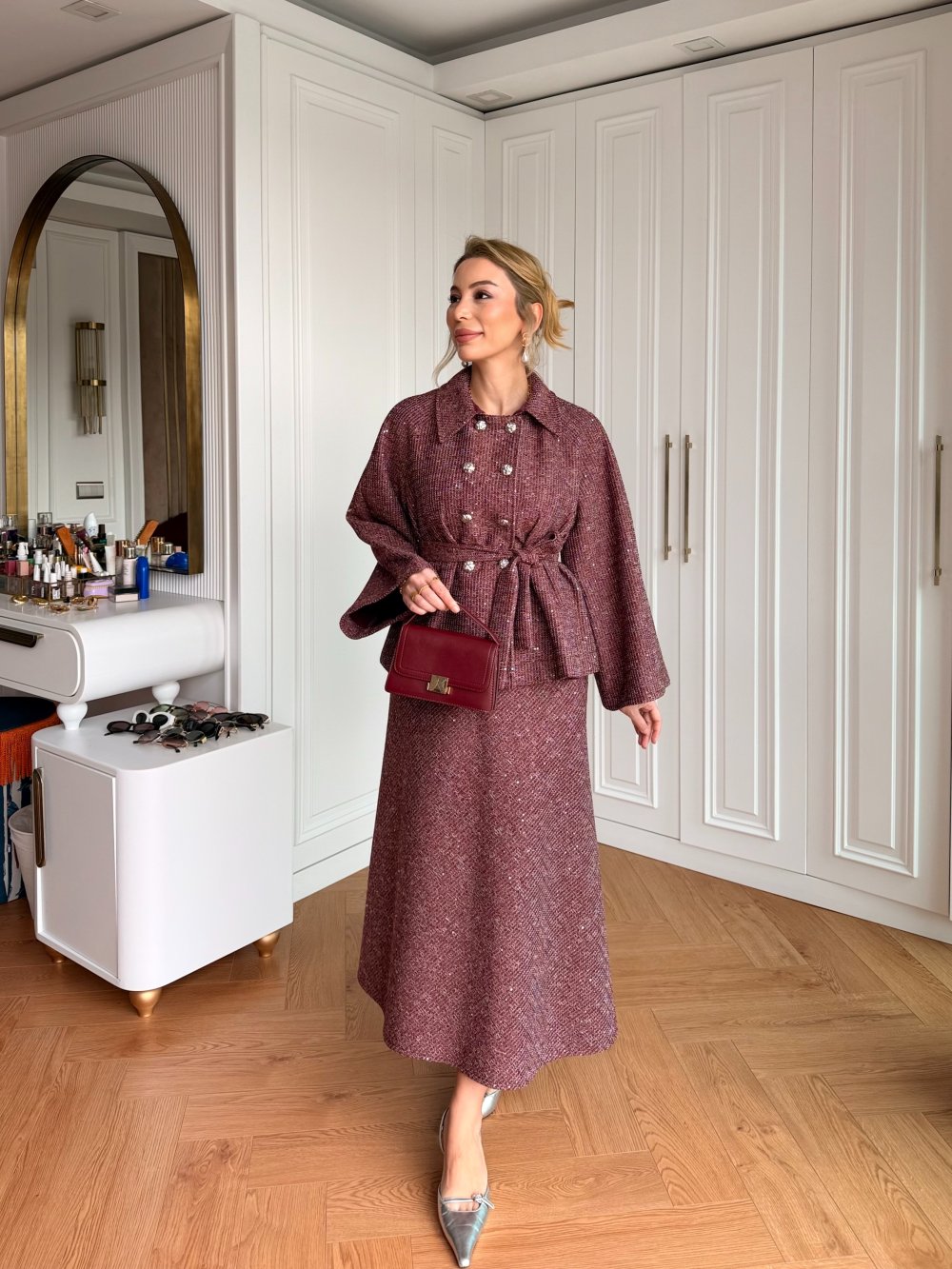 هذا الطقم مصنوع من قماش متقن من الدرجة الأولى مغطى بالجلد المخملي ومزين بالترتر. السترة تتميز بإغلاق كامل بالأزرار وأكمام واسعة مع حزام قابل للإزالة. تصميم الكتف منخفض مع تفاصيل ترتر دقيقة على القماش. التنورة تحتوي على خصر مرن وحاشية مرنة. المقاسات: طول السترة 69 سم، الصدر 55 سم؛ طول التنورة 95 سم، الخصر 32 سم.