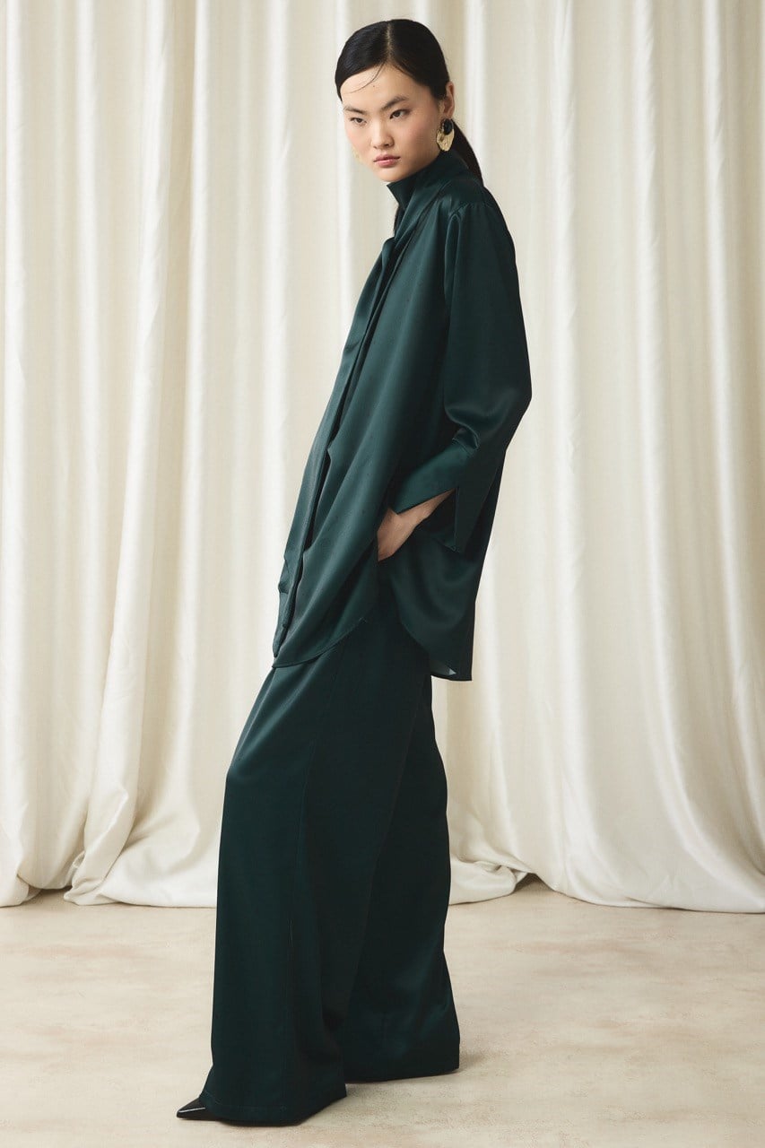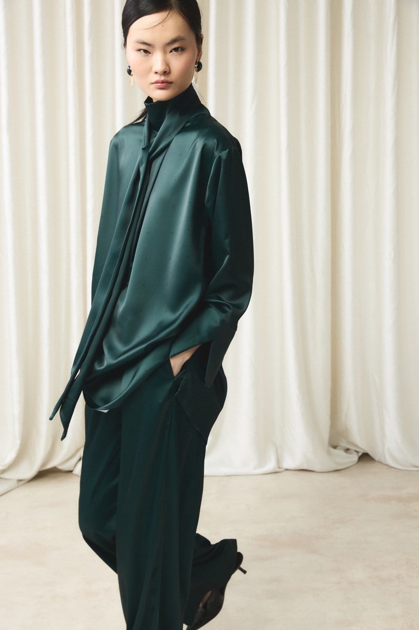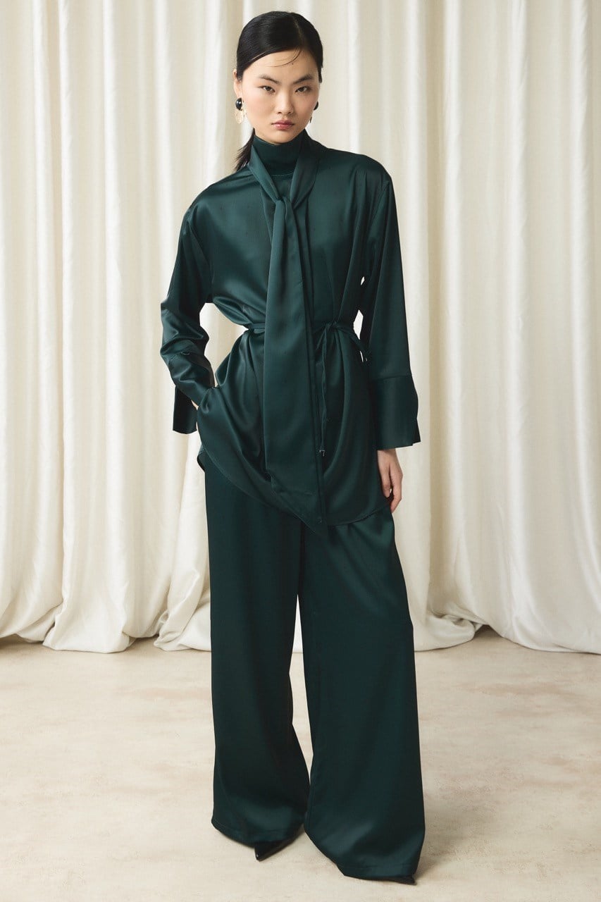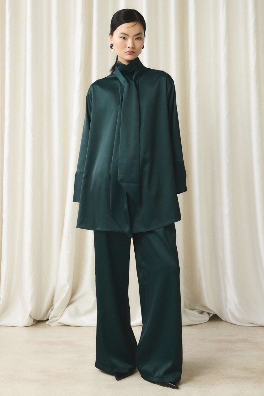 طقم ساتان بنقاط صغيرة مع ياقة مربوطة – الزمردي