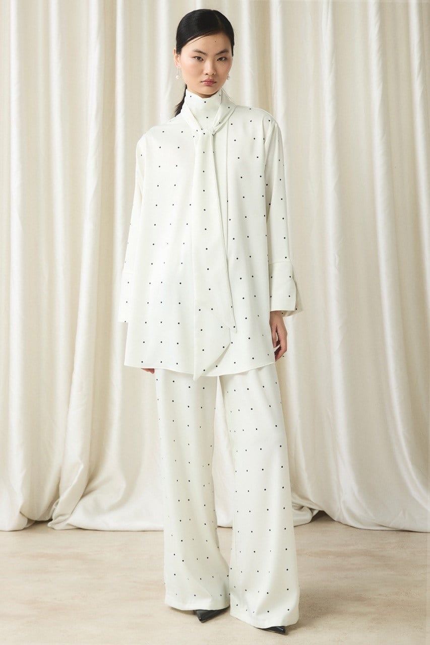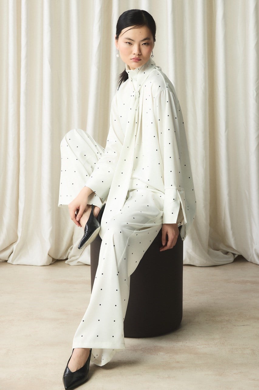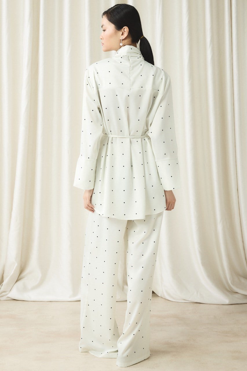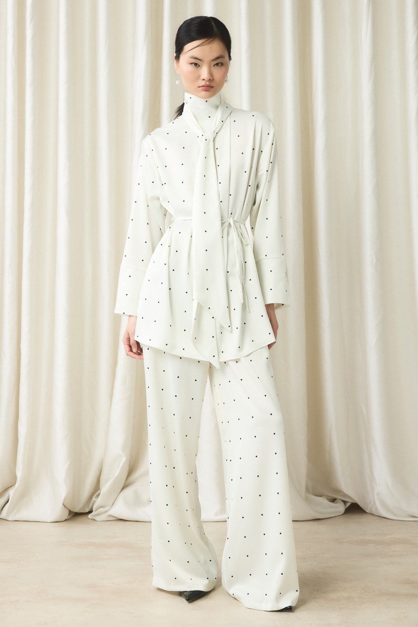 يتميز هذا الطقم الأنيق والحديث بتصميمه البسيط وقصته المريحة التي تمنح الراحة طوال اليوم. تضيف تفصيلة الربط عند الياقة العالية لمسة أنيقة، بينما تمنح البنطلونات الواسعة حرية الحركة. بفضل قماشه الخفيف والجاري، يمكن اختياره للارتداء اليومي وللمناسبات الخاصة.