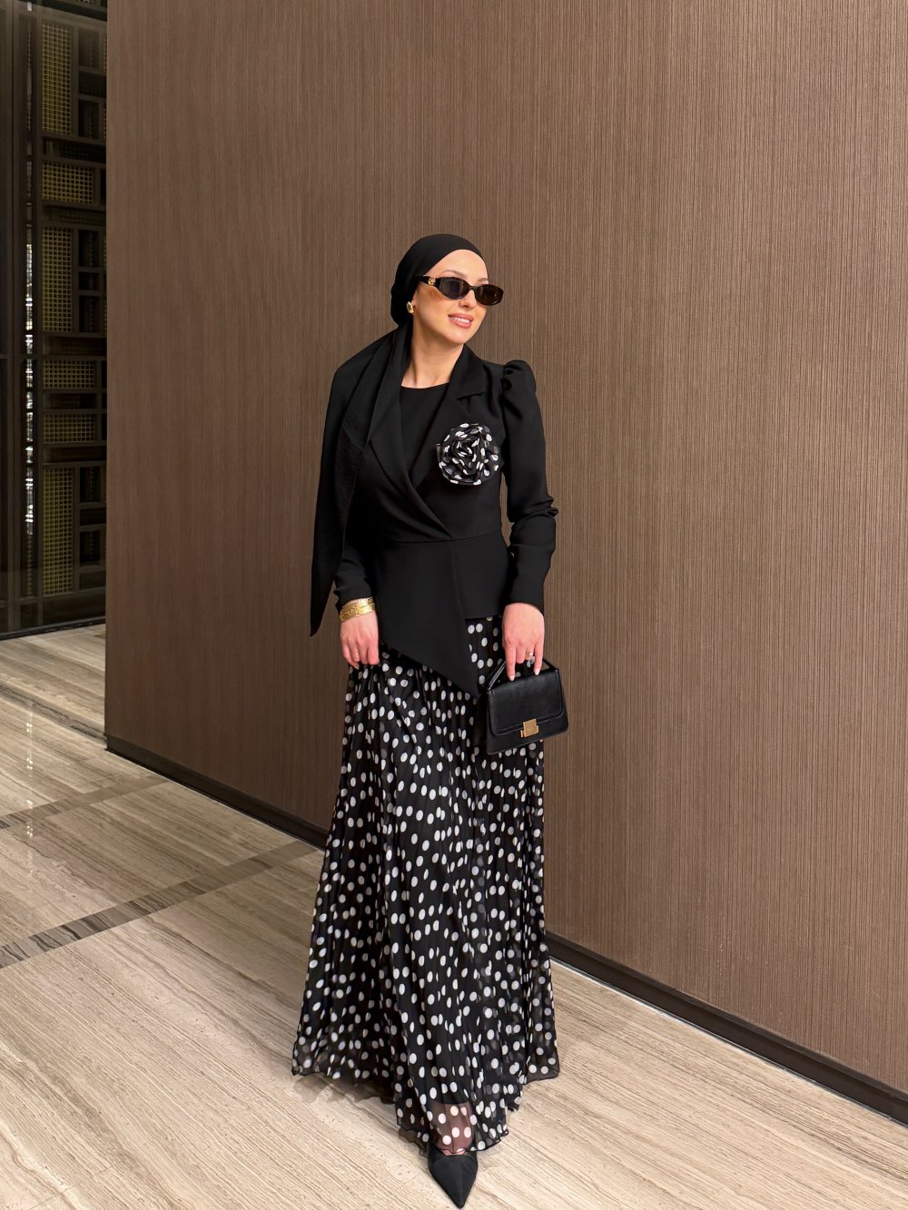 السترة مصنوعة من شيفون كريب من الدرجة الأولى مع تنورة. تحتوي على تفاصيل زهرة قابلة للفصل. السترة مزودة بسحاب جانبي. تحتوي السترة على دعم للصدر. أكتاف السترة مبطنة. قياسات السترة: الكتف 32 سم، الصدر 44 سم، الخصر 39 سم، الطول 59 سم. التنورة مزودة بنقاط منقطة. التنورة تحتوي على سحاب خلفي. التنورة مبطنة. طول التنورة: 113 سم.