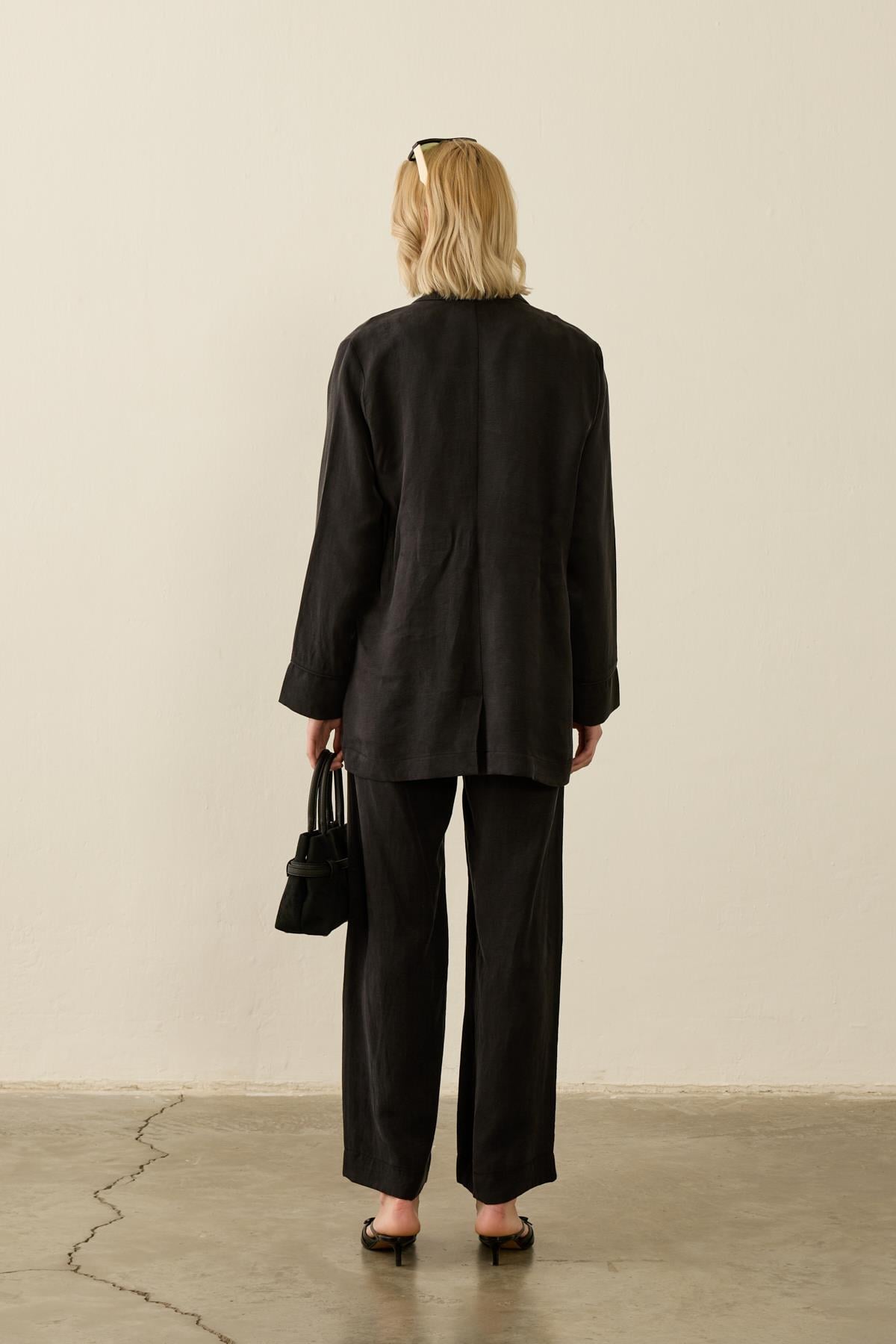 طقم سيلين باللون الأسود مع سترة وسراويل واسعة