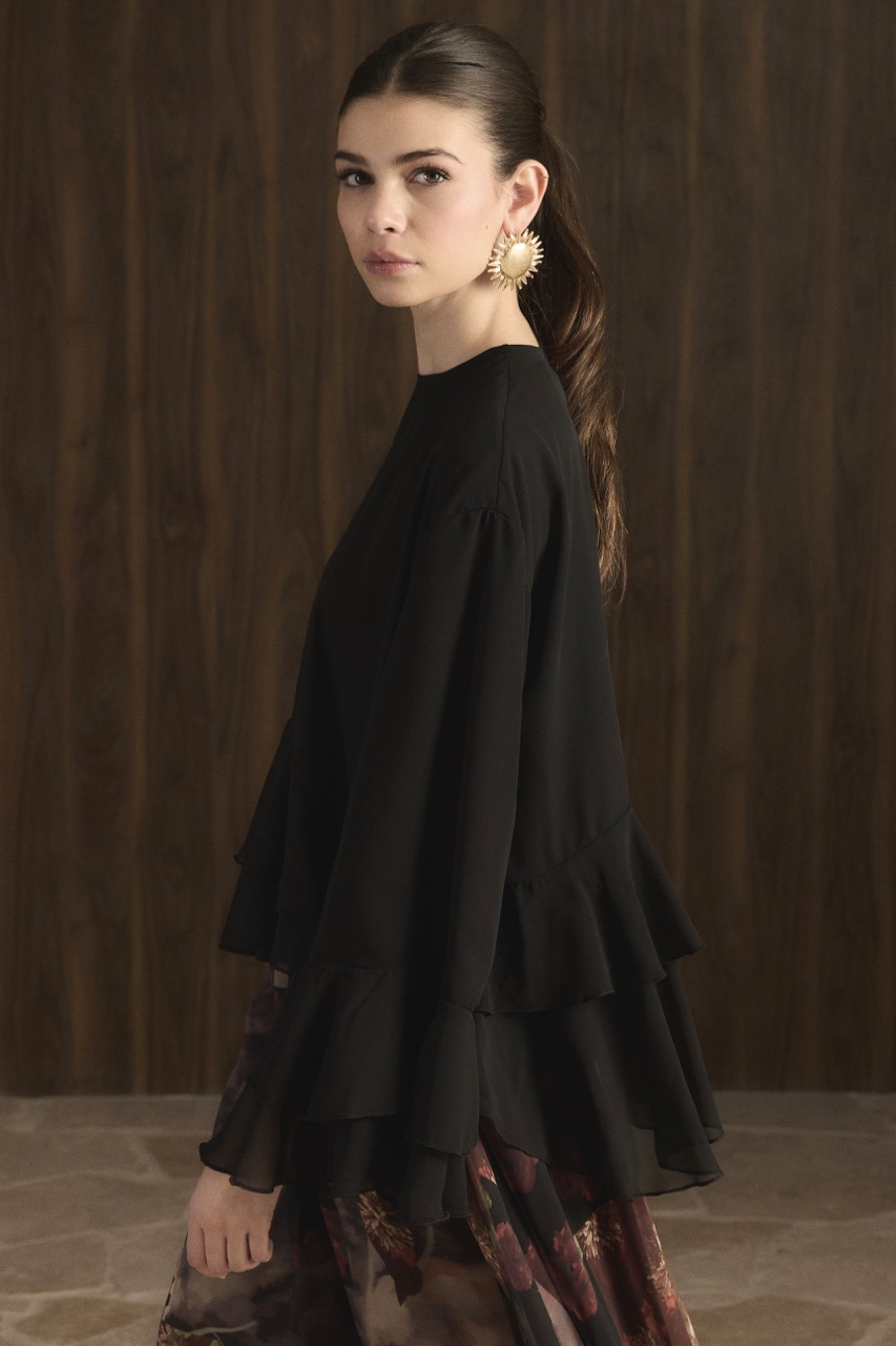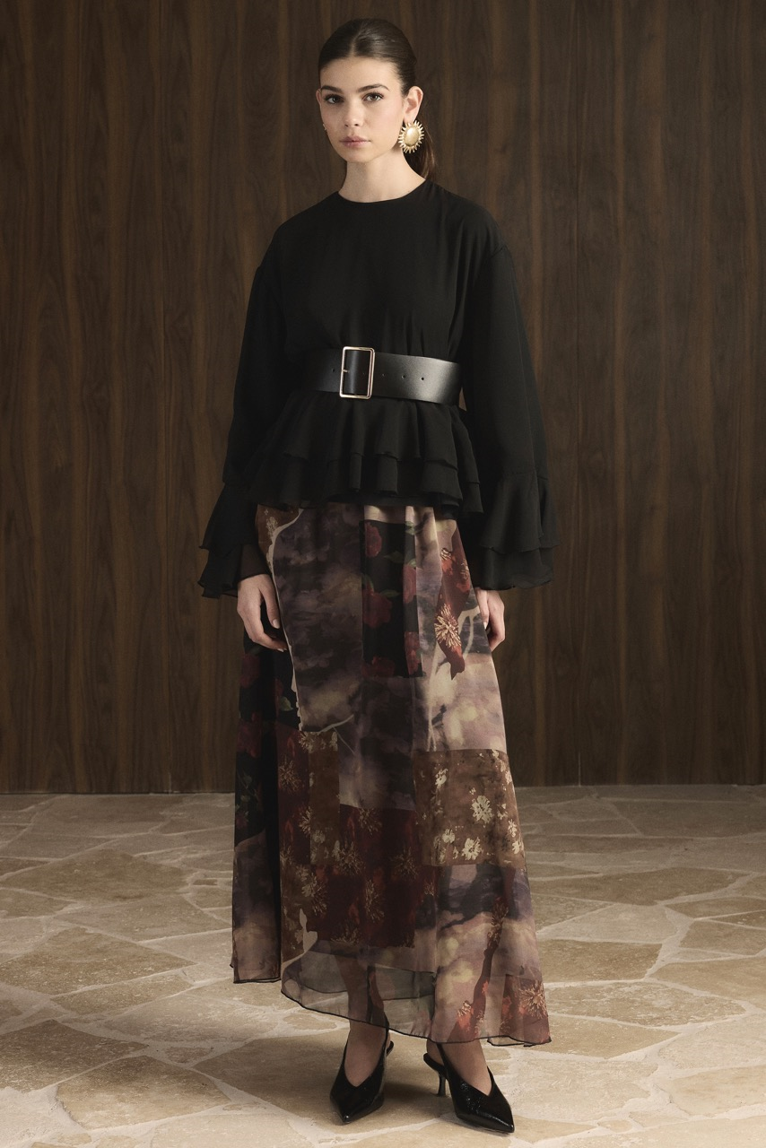 يتميز هذا الطقم الأنيق من الشيفون بتصميم منقوش جميل، مثالي لخلق إطلالات راقية وعصرية. يوفر قماش الشيفون الخفيف الراحة والحركة الأنيقة، مما يجعله مثالياً للمناسبات المختلفة من النزهات العادية إلى المناسبات الخاصة. يضيف اللون الأسود الكلاسيكي تنوعاً إلى خزانة ملابسك.
