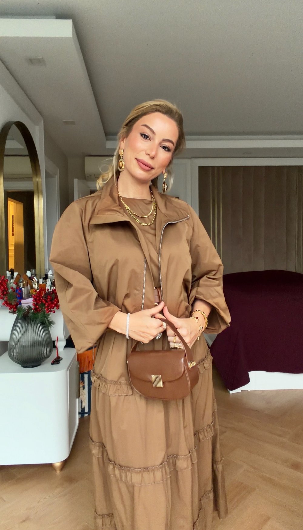 يبرز هذا الفستان الطويل بتصميم أنيق وتفاصيل عصرية، حيث يظهر وقفة مثالية بفضل قماش الترينش المتين والمرن في الوقت نفسه. تضيف التفاصيل المطوية في المقدمة حركة للتصميم، بينما يؤكد خط الخصر مع الحزام على منحنيات الجسم بأناقة. بطوله الكامل وتصميمه البسيط، يقدم خياراً أنيقاً للمناسبات الخاصة وللستايل الحضري.