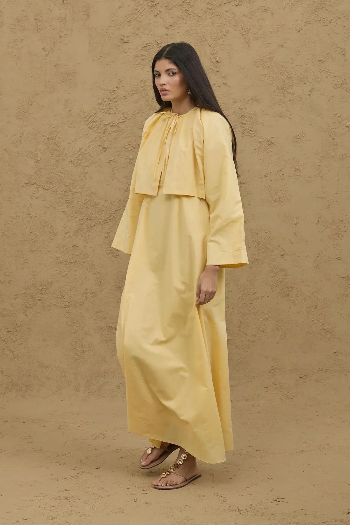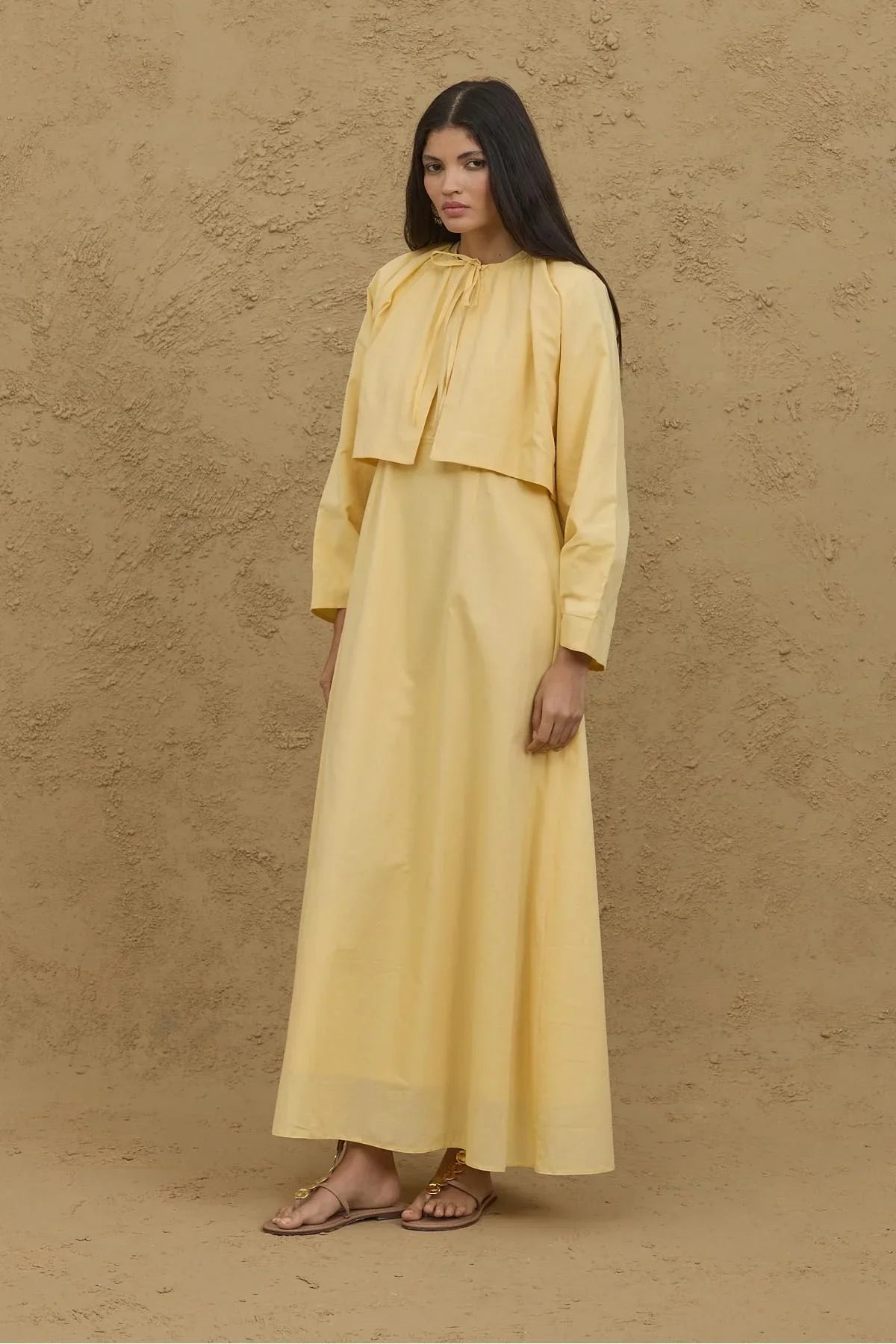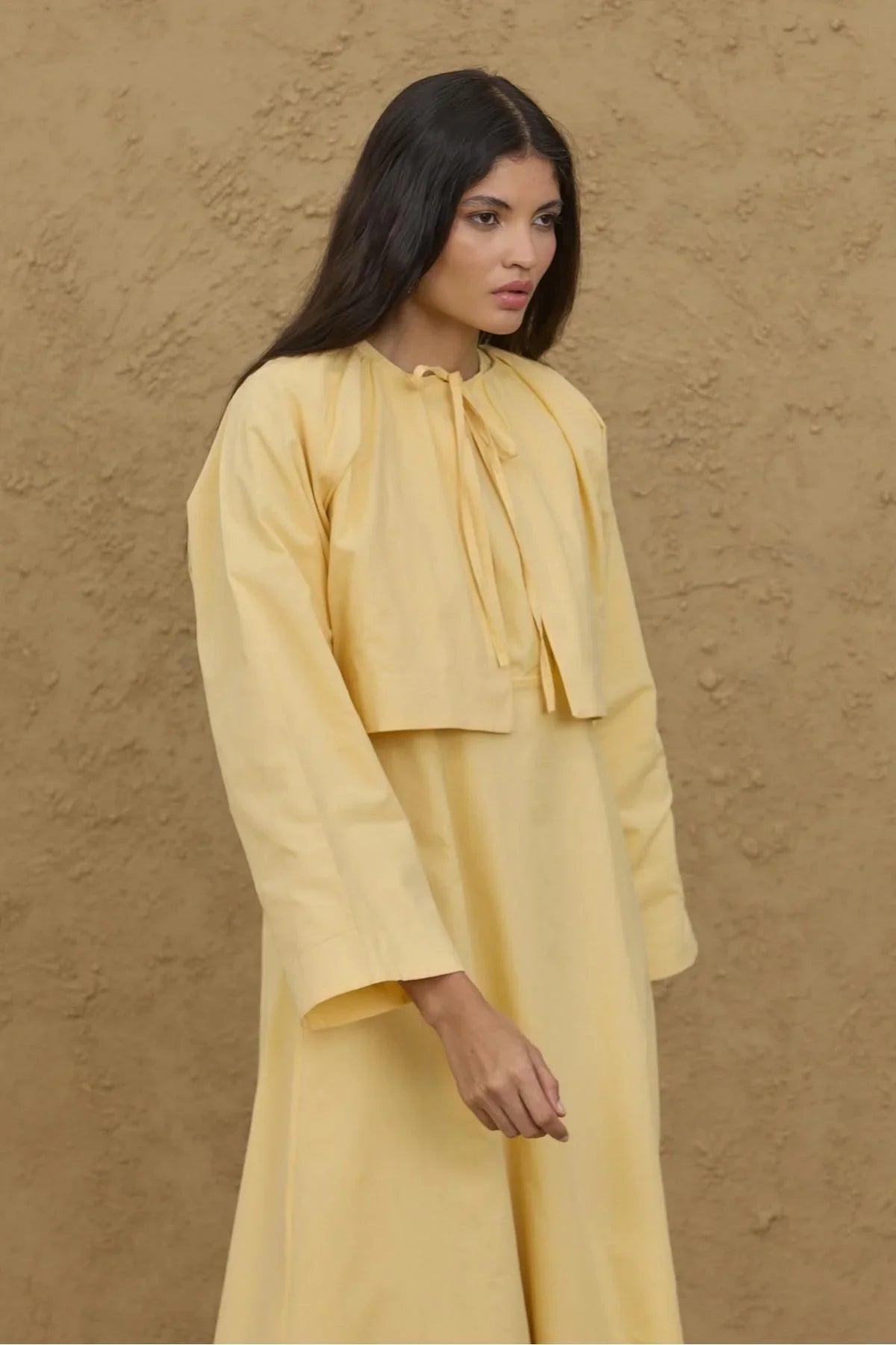 مصنوع من قماش القطن الخالص بنسبة 100%، يتميز هذا الطقم بجاكيت محصور ورباط أمامي وأكمام واسعة، وفستان بأحزمة سميكة وظهر بسحاب.