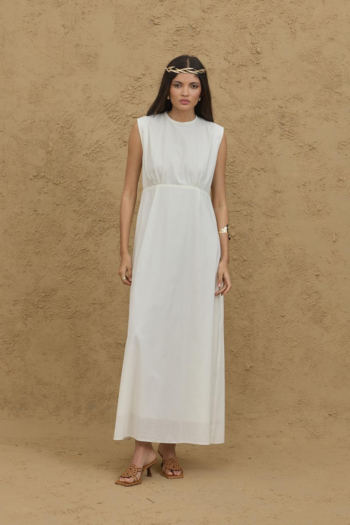 مصنوع من قماش الفوال القطني بنسبة 100%، يتميز هذا الطقم بجاكيت محصور وأكمام واسعة ورباط أمامي، يرافقه فستان بأحزمة سميكة وإغلاق خلفي بسحاب.