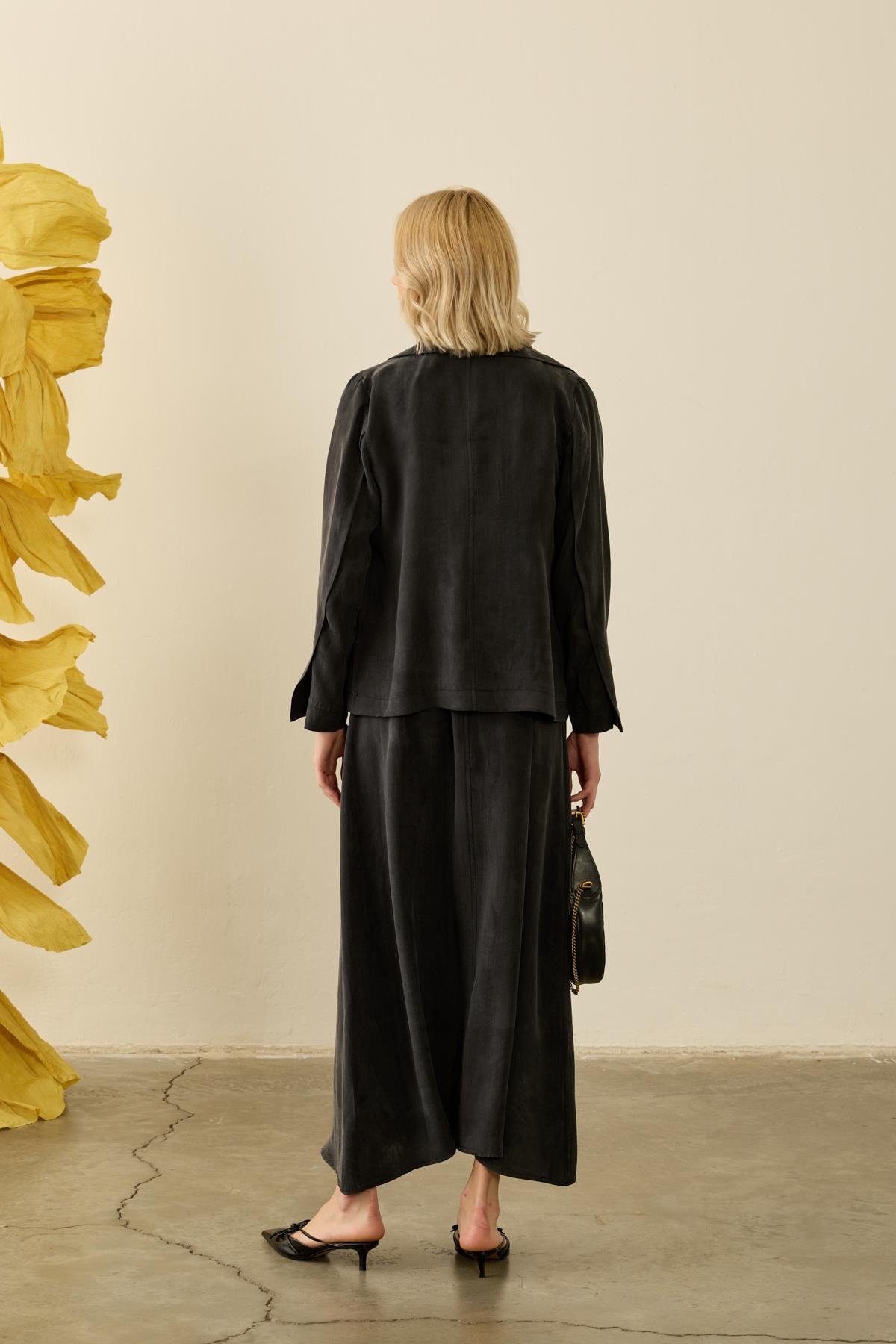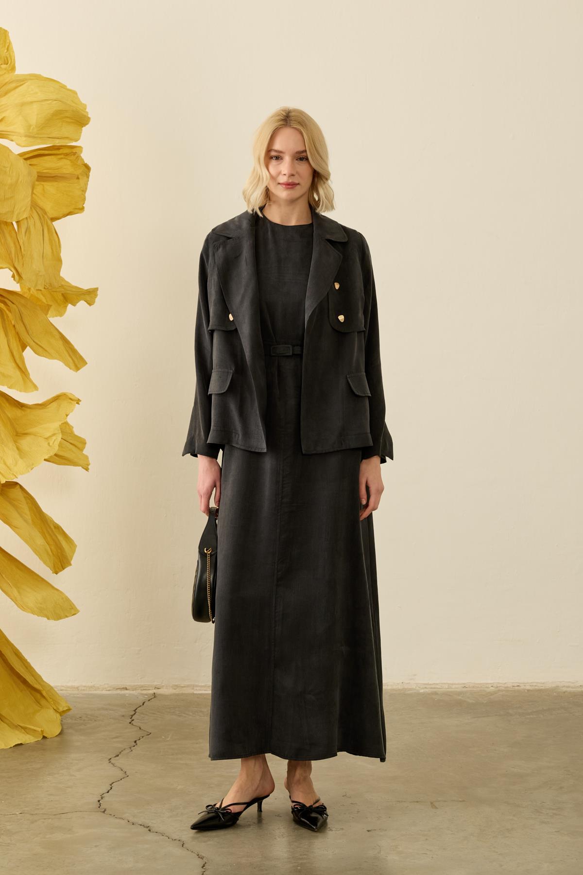 يبرز هذا الفستان الطويل بتصميم أنيق وتفاصيل عصرية، حيث يظهر وقفة مثالية بفضل قماش الترينش المتين والمرن في الوقت نفسه. تضيف التفاصيل المطوية في المقدمة حركة للتصميم، بينما يؤكد خط الخصر مع الحزام على منحنيات الجسم بأناقة. بطوله الكامل وتصميمه البسيط، يقدم خياراً أنيقاً للمناسبات الخاصة وللستايل الحضري.