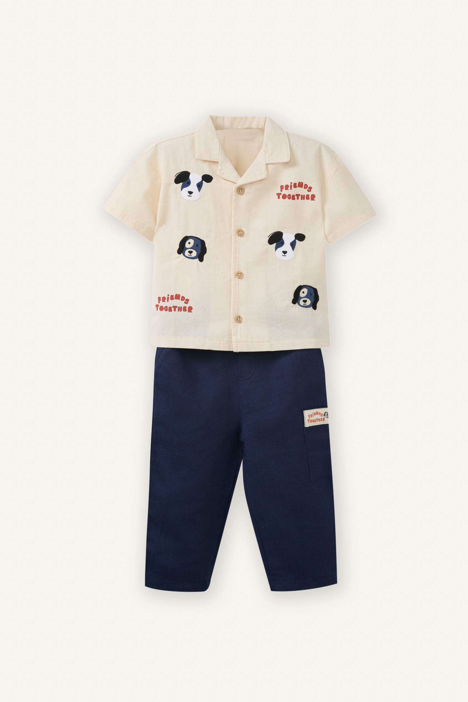 طقم قطني مكون من قطعتين للصبيان برسومات حيوانات، يتميز بقماشه الناعم والتنفس الذي يضمن راحة طفلك طوال اليوم. تضيف الرسومات الحيوانية اللطيفة مظهراً مرحاً وأنيقاً.