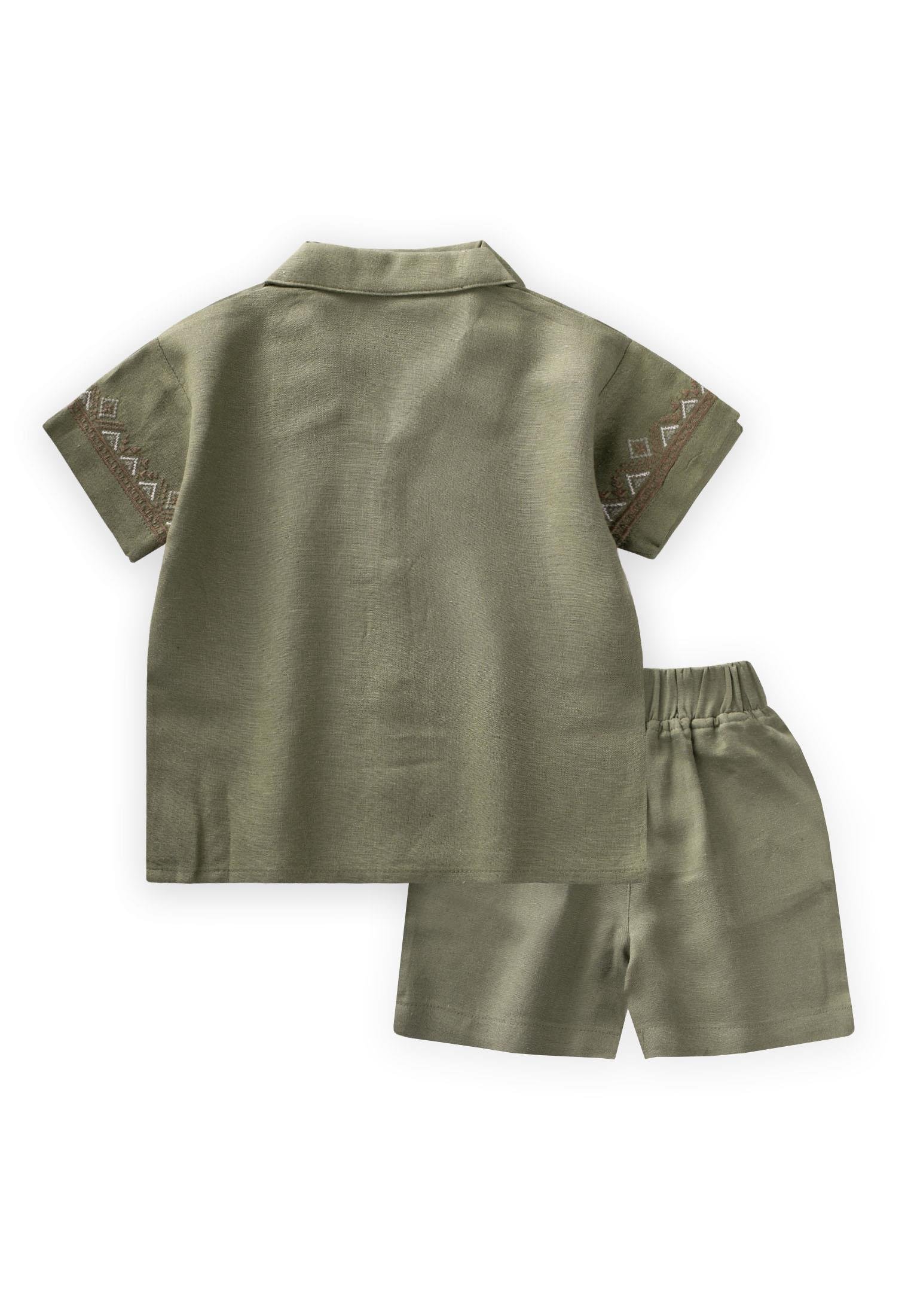 طقم كتان بقميص بأكمام مطرزة وسراويل قصيرة للأعمار 2-7 سنوات باللون الأخضر الكاكي
