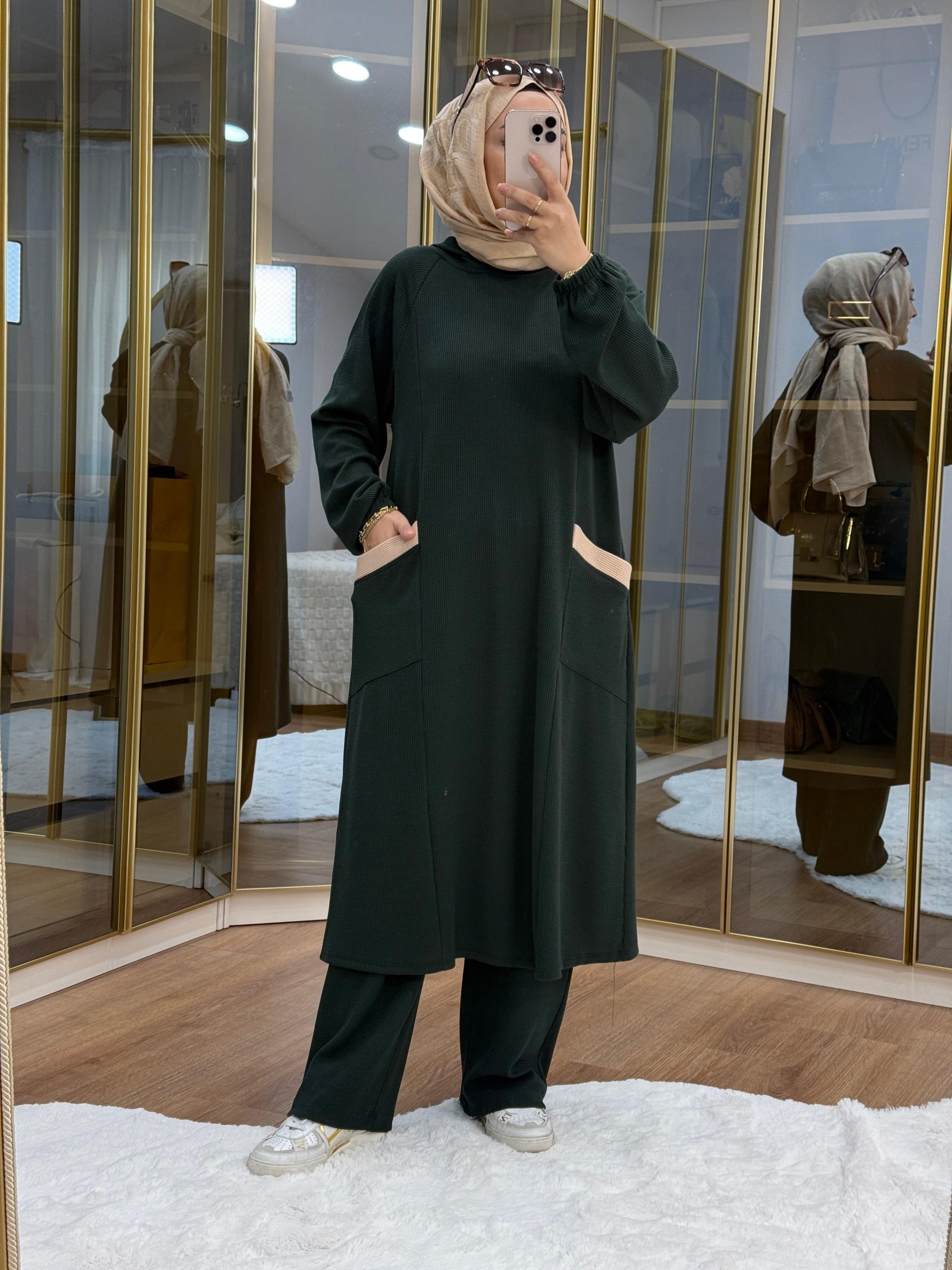 طقم مخملي مطرز باللون الكاكي