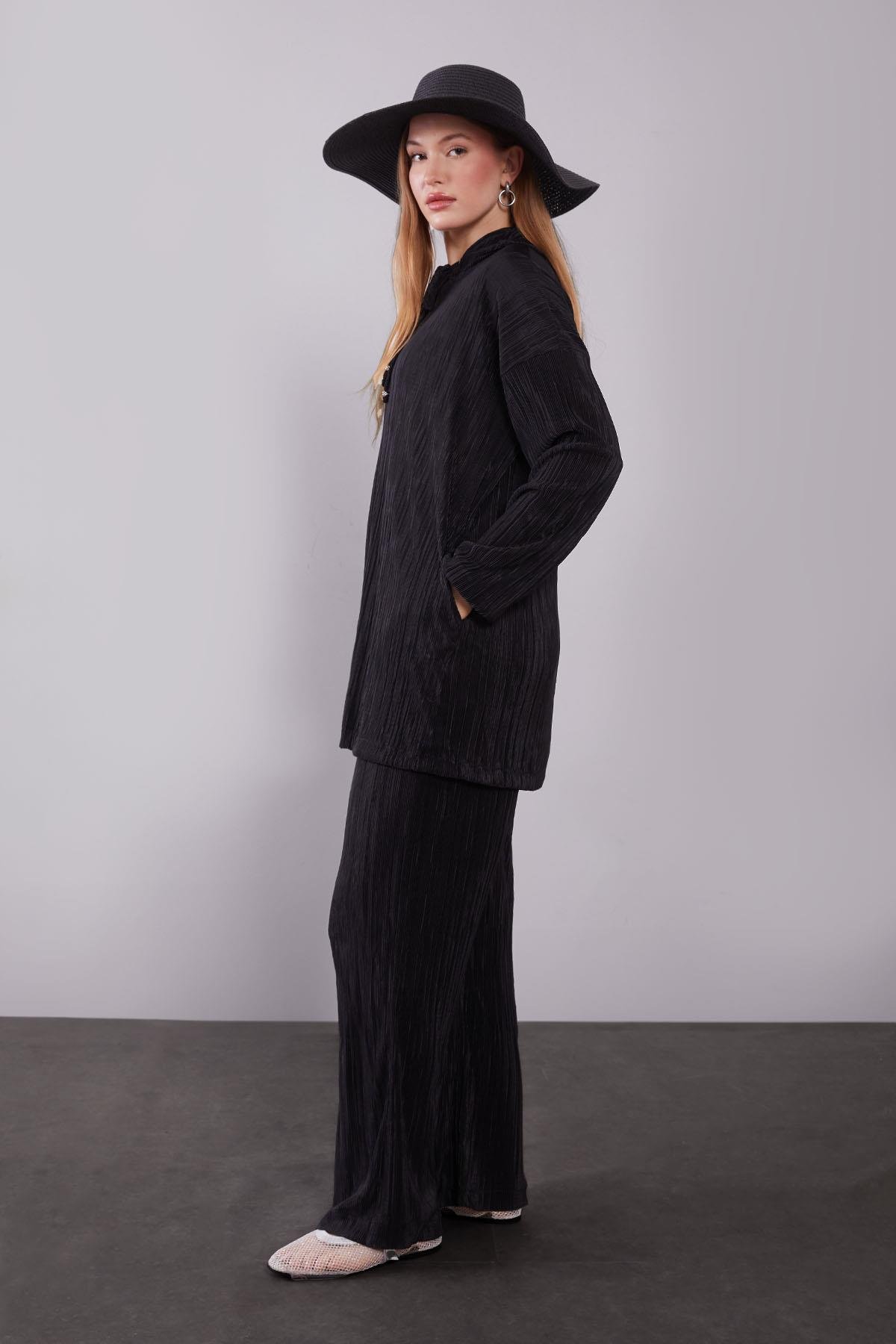 طقم مزدوج أسود ذو قلنسوة وتفاصيل حبال