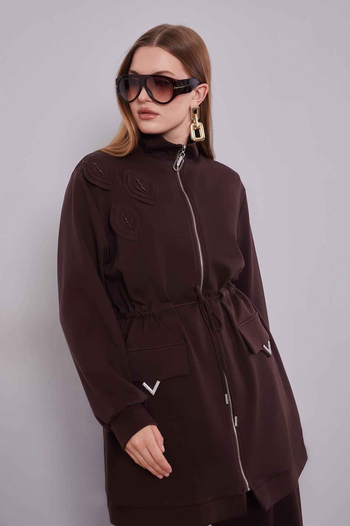 طقم مزدوج بتفاصيل إكسسوار الجيب بلون القهوة المرّة