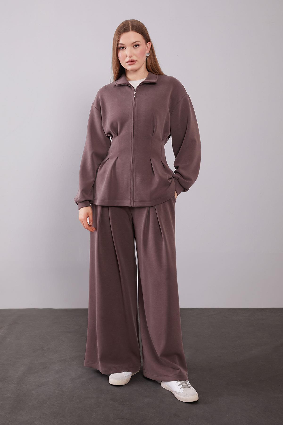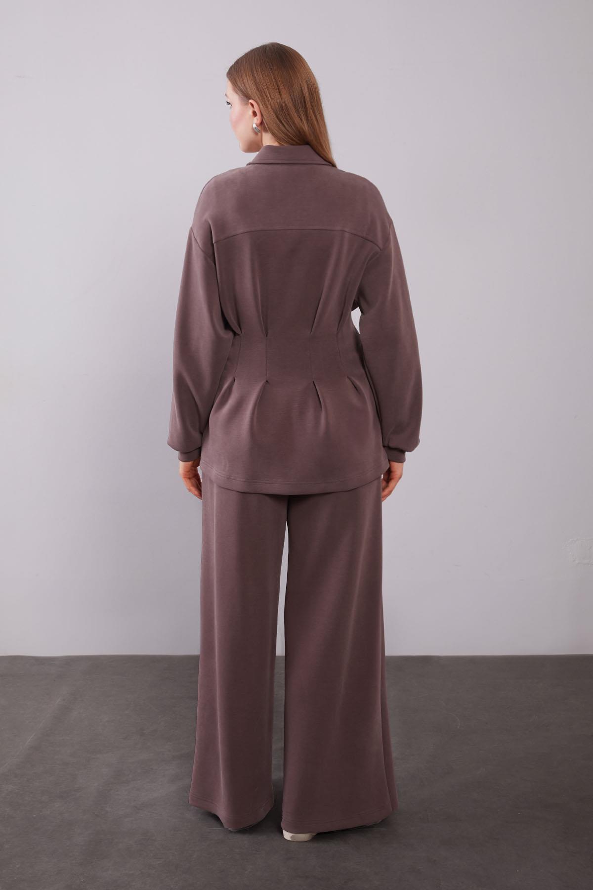 طقم مزدوج بتفاصيل طيات بنية اللون مع خصر مريح