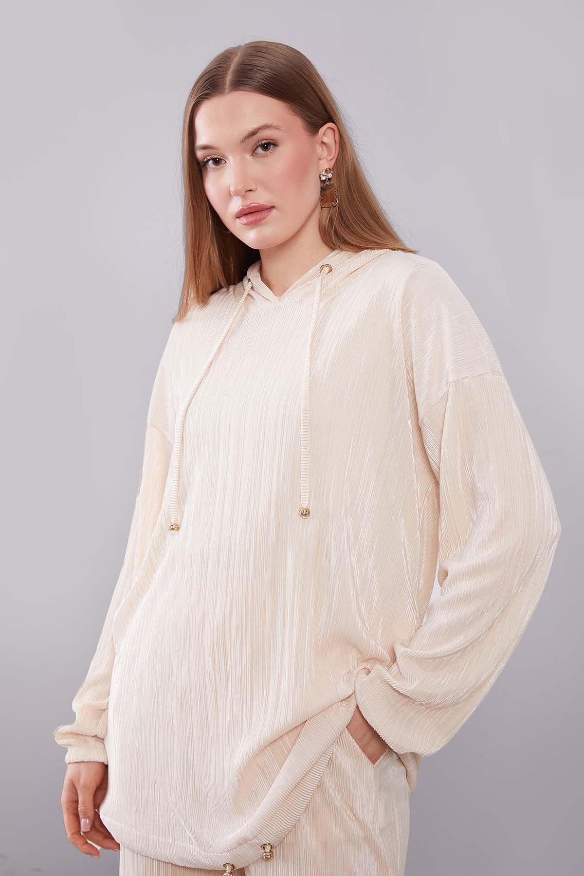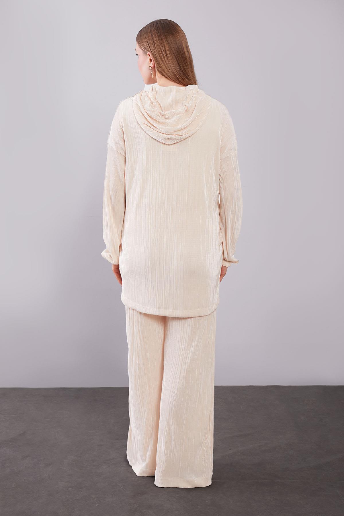 طقم مزدوج بلون البيج مع قلنسوة وتفاصيل أربطة