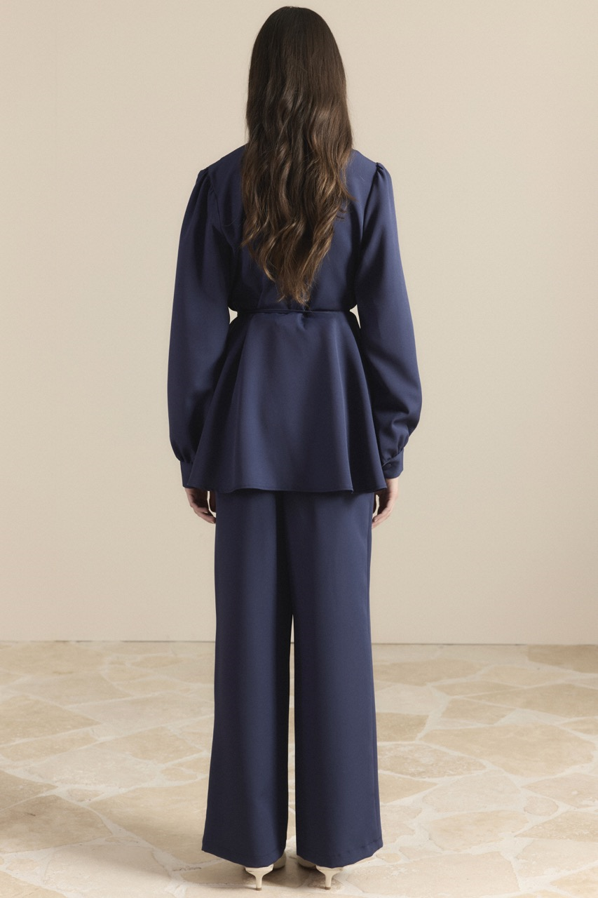 طقم مزدوج أنيق بتصميم كروازيه مطرز بالحجارة الزخرفية بلون أزرق نيلي راقي، مثالي لإطلالة عصرية وجذابة.