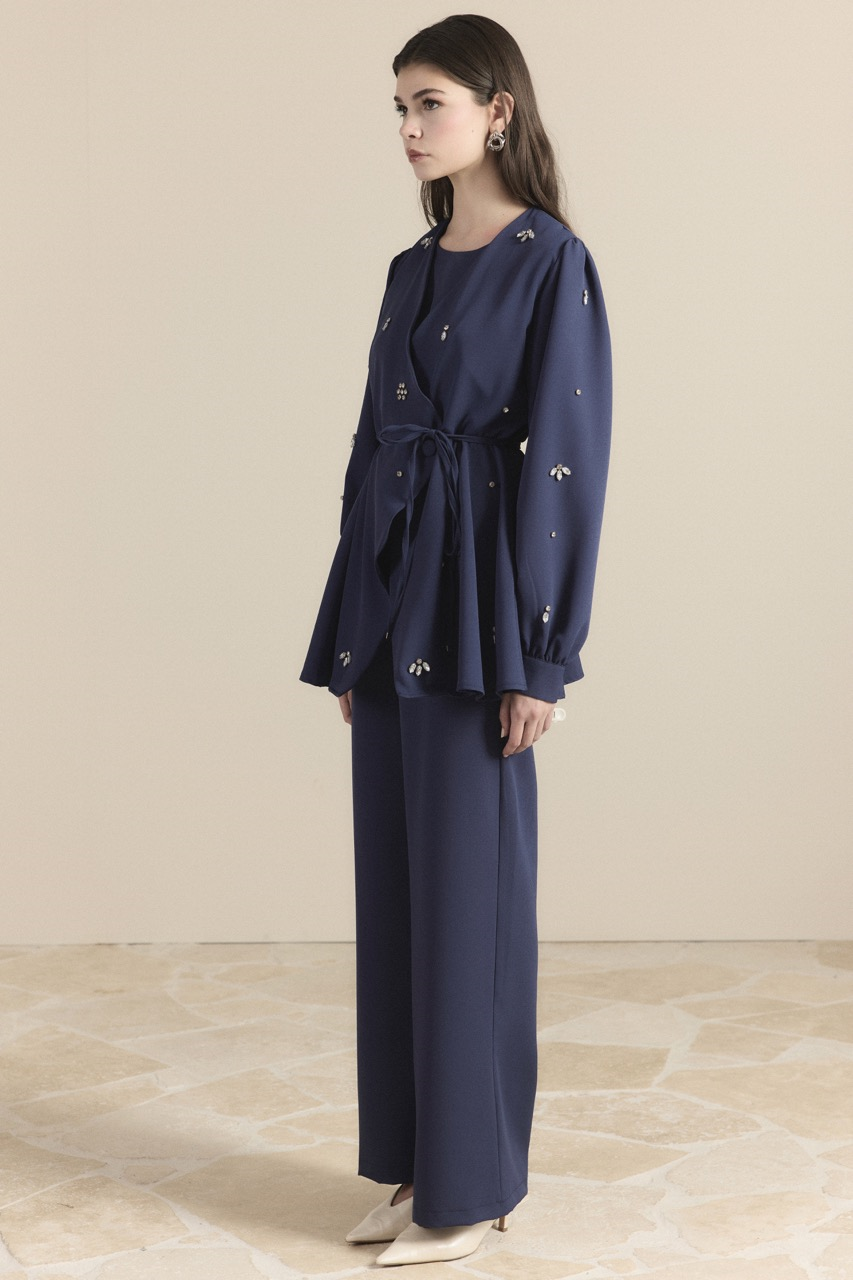 طقم مزدوج مطرز بالحجارة – أزرق نيلي