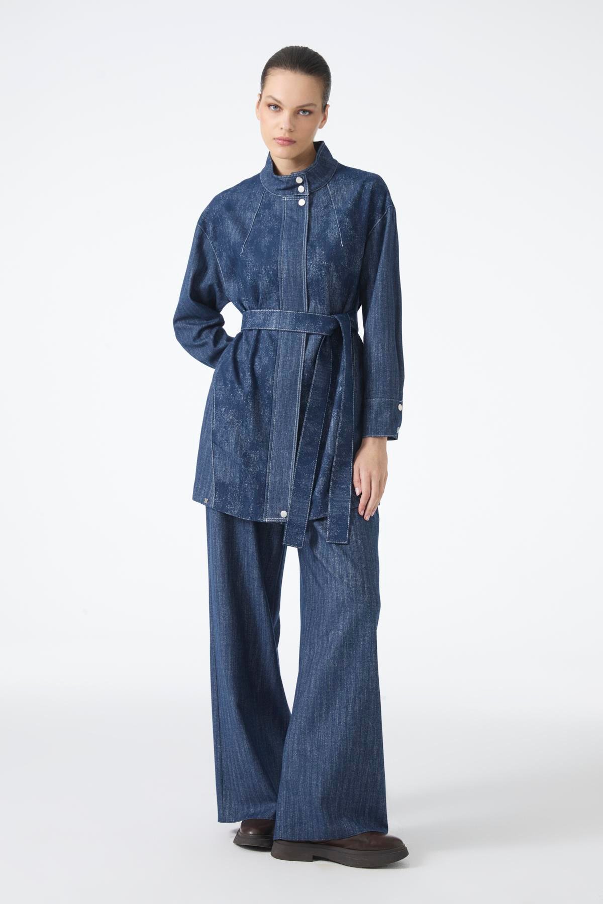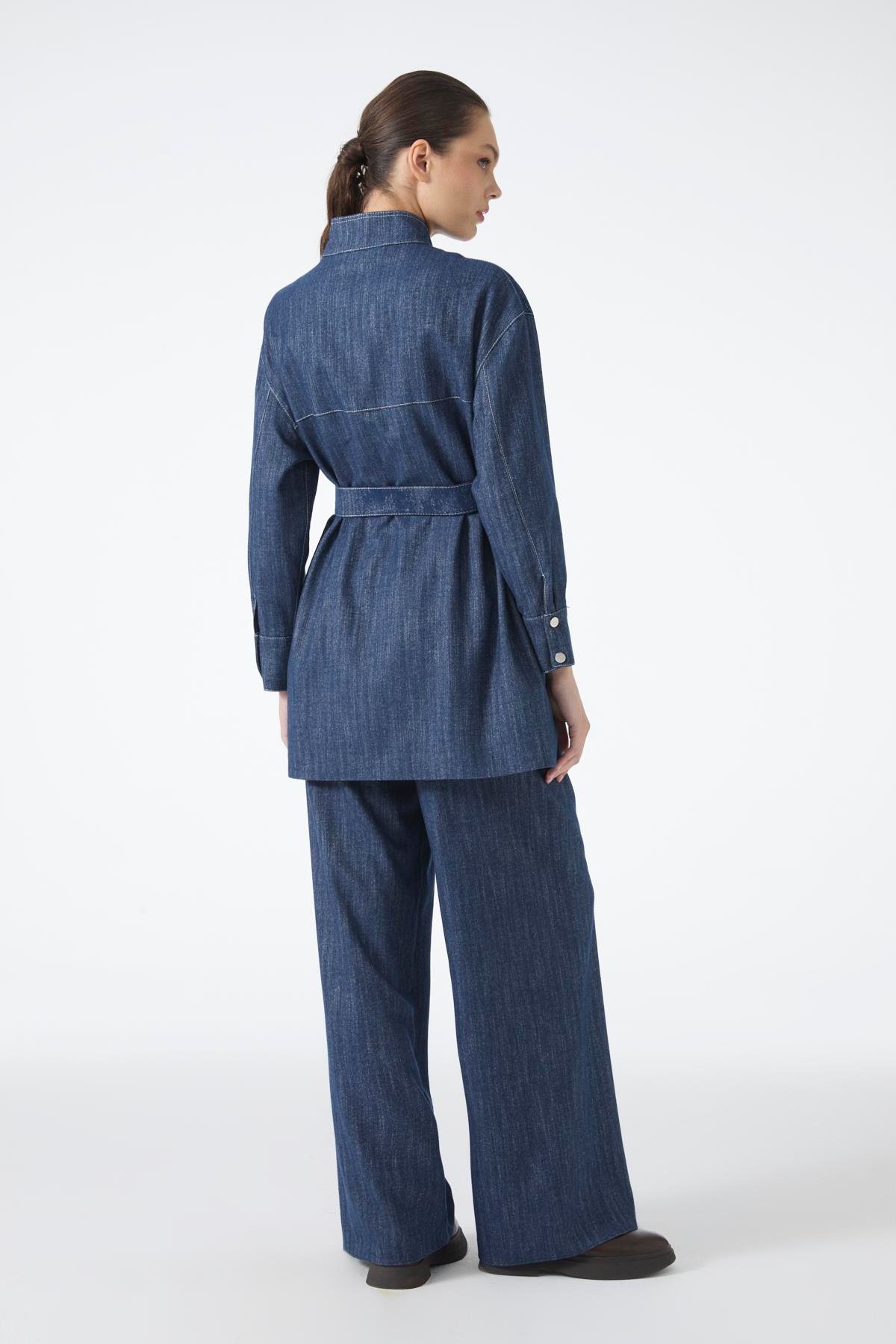 يجمع هذا الطقم المزدوج بين الأناقة الخالدة للون الأزرق الداكن والقص العصري، حيث يتكون من سترة مربوطة بحزام وبنطلون واسع الأرجل. يتميز هذا الطقم بتنوعه المناسب للاستخدام اليومي أو المناسبات الخاصة، ويوفر راحة في الارتداء بفضل تصميمه المريح.