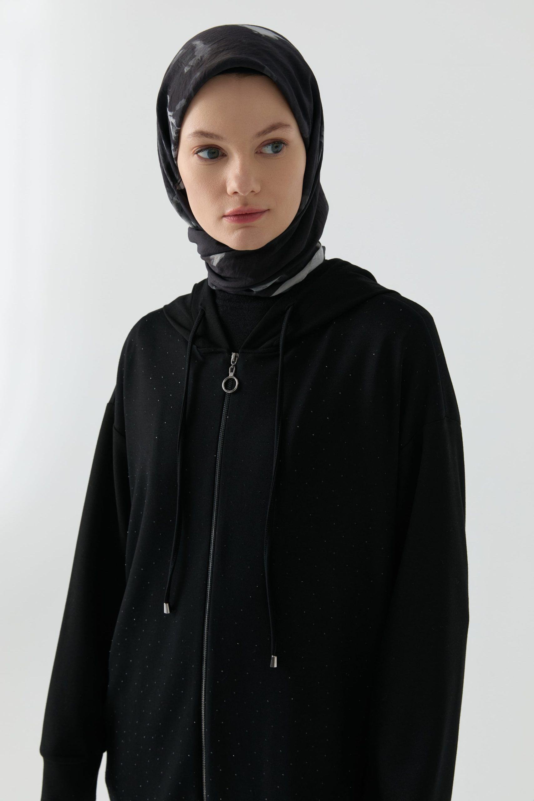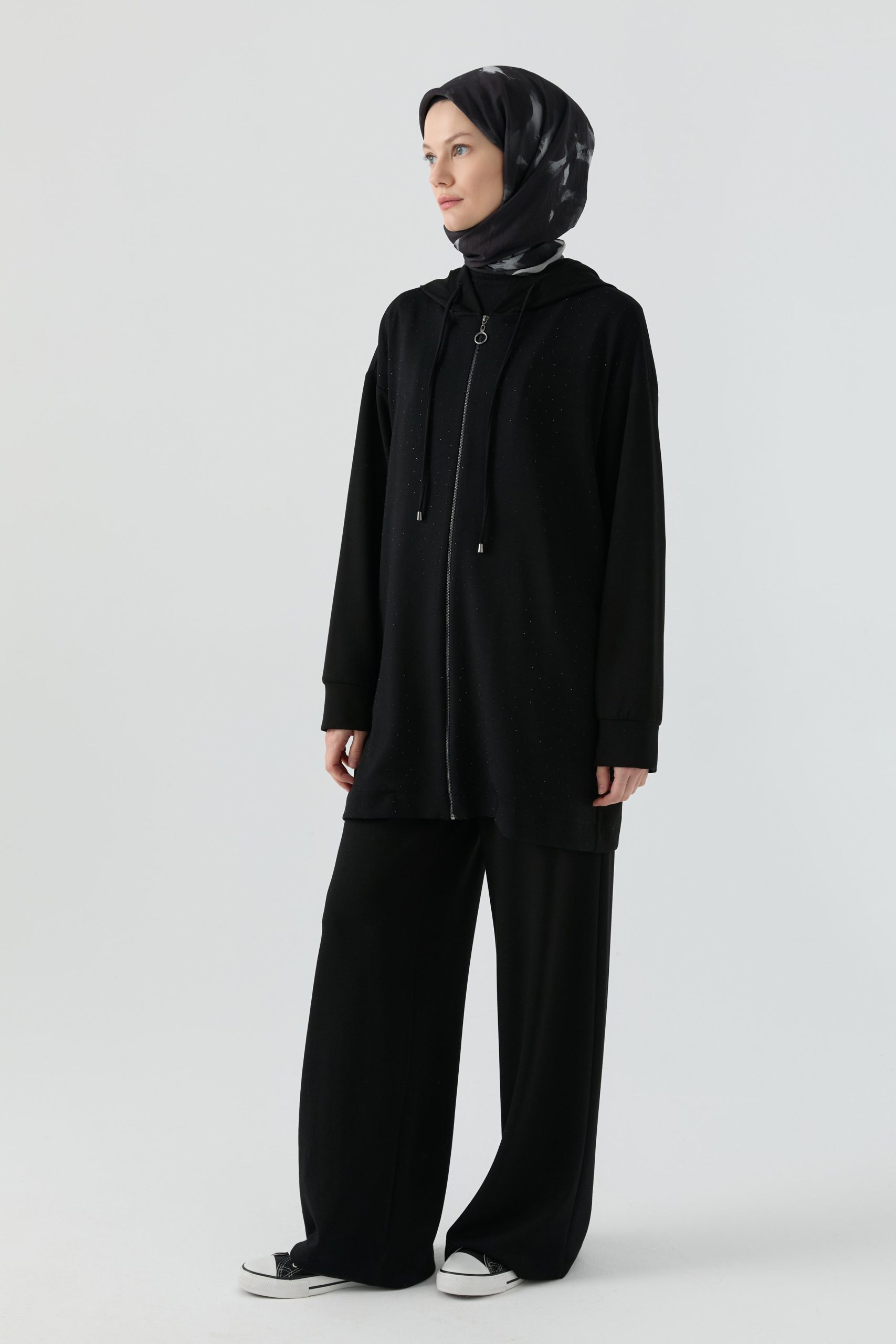 يضفي هذا الطقم بريقًا ساحرًا مع زخارف حجرية رقيقة، متوازنًا ببراعة بين الأناقة والخطوط العصرية. تضيف التفاصيل المتلألئة لمسة راقية للتصميم، بينما يشكل الجزء العلوي والسفلي المتناغمان هيئة أنثوية رشيقة.