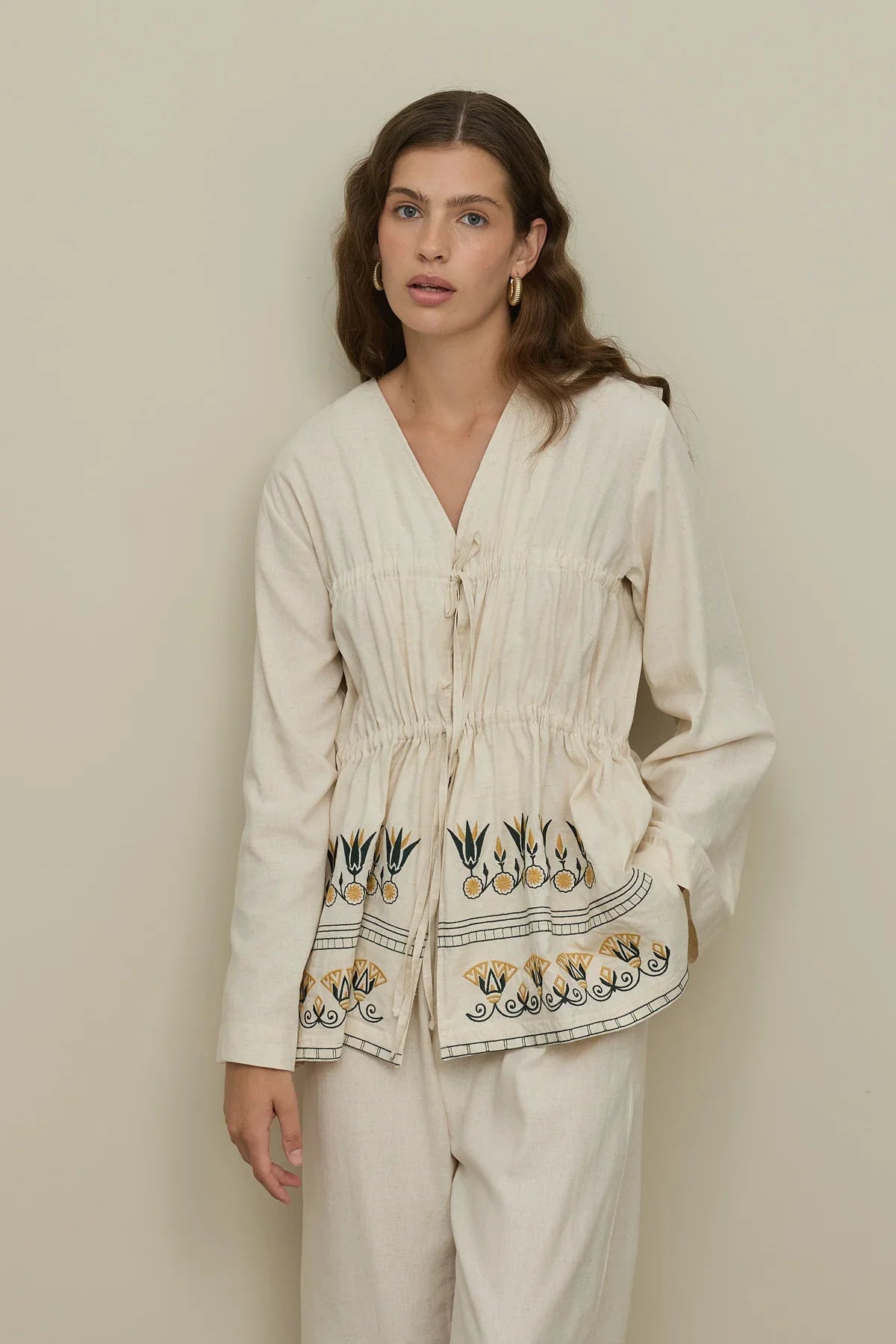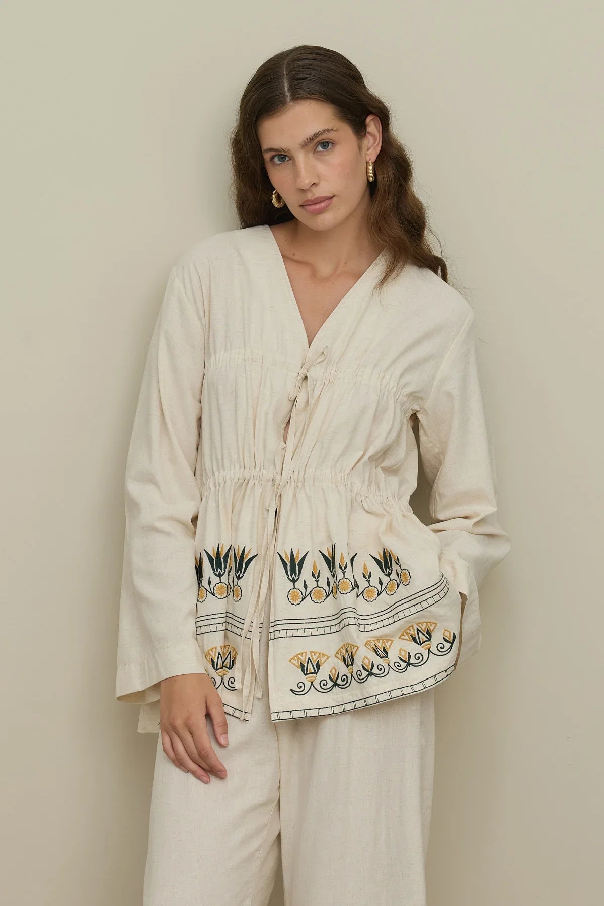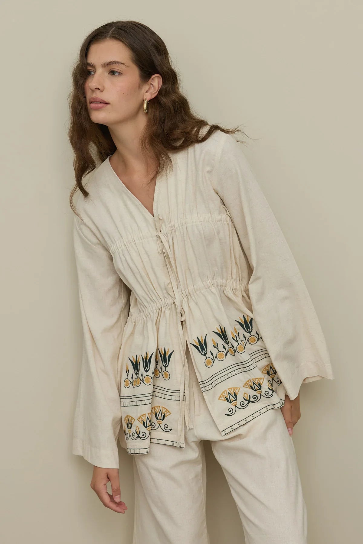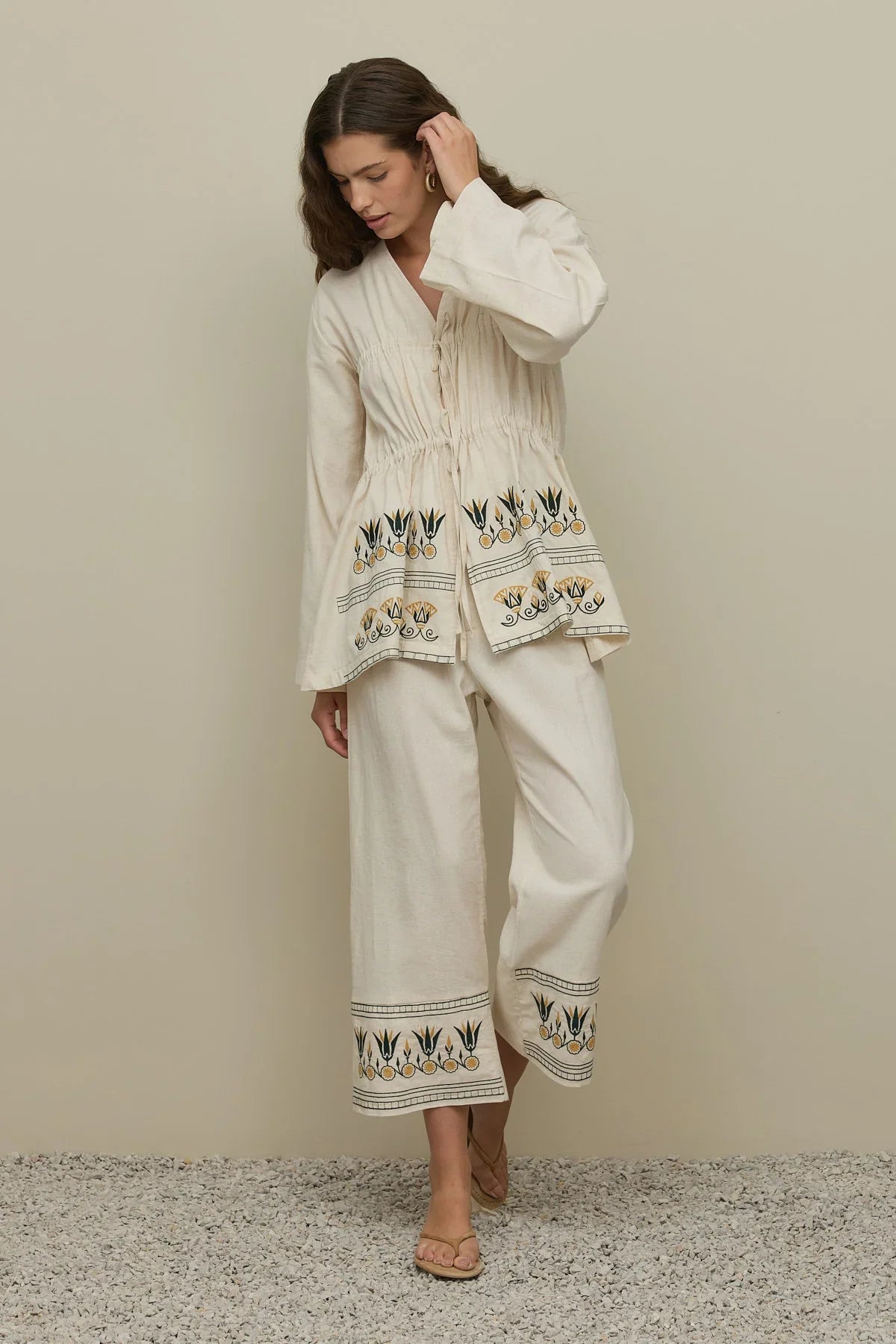 يتميز بتفاصيل مجمعة في الجزء الأمامي، ومزيج من الكتان في النسيج، وتفاصيل مطرزة، وكيمونو بأكمام واسعة، وبنطلونات على طراز الكولوت مع أطراف مطرزة.