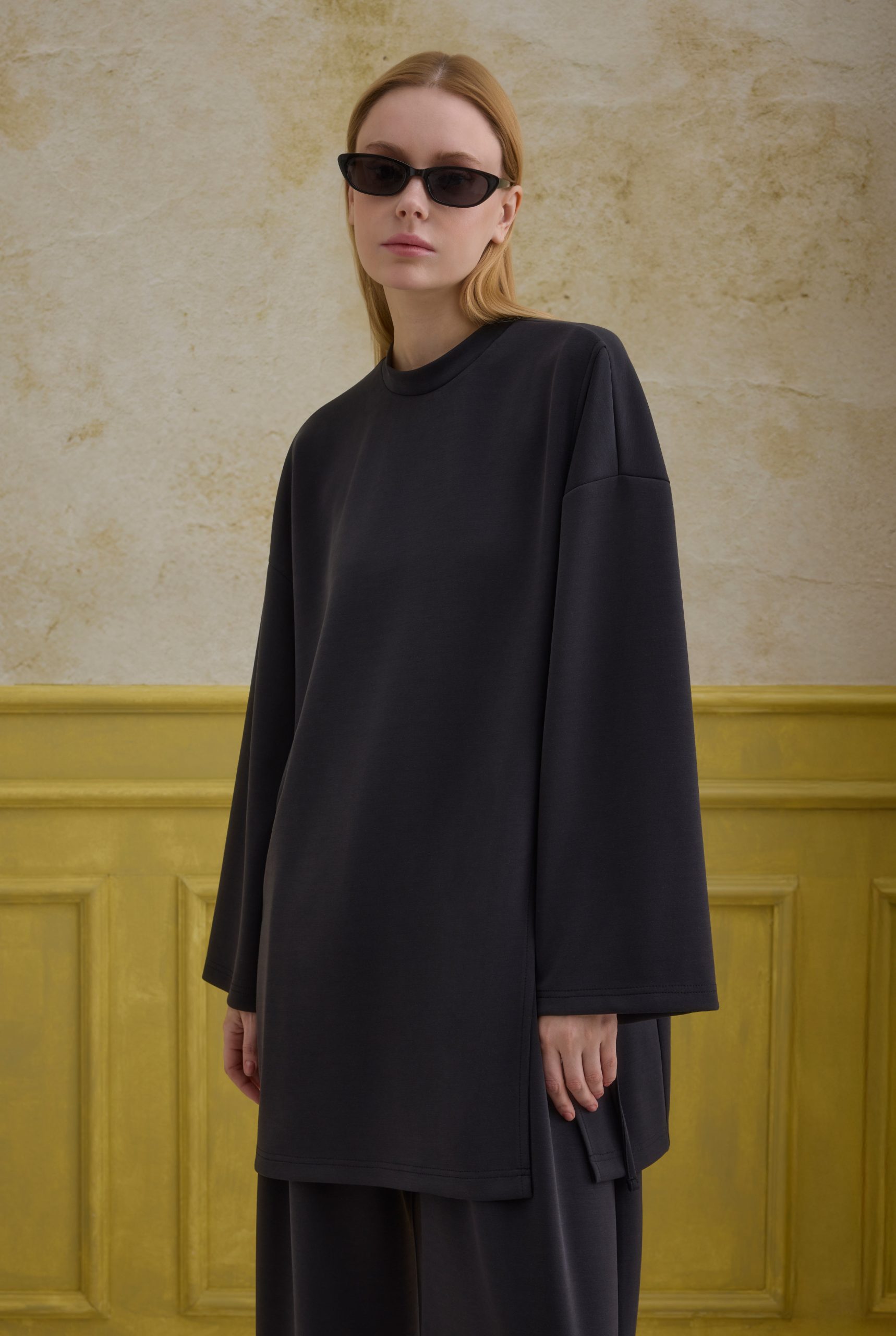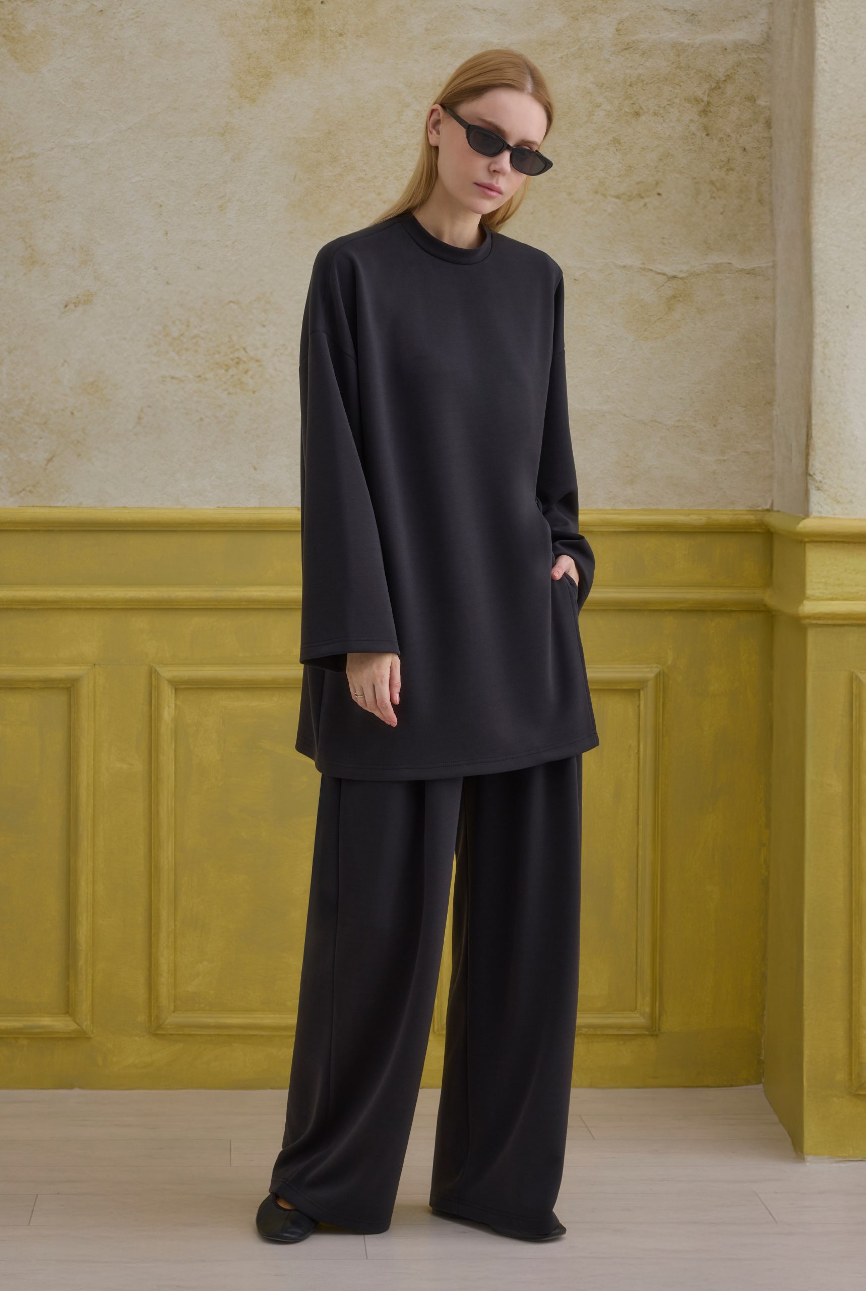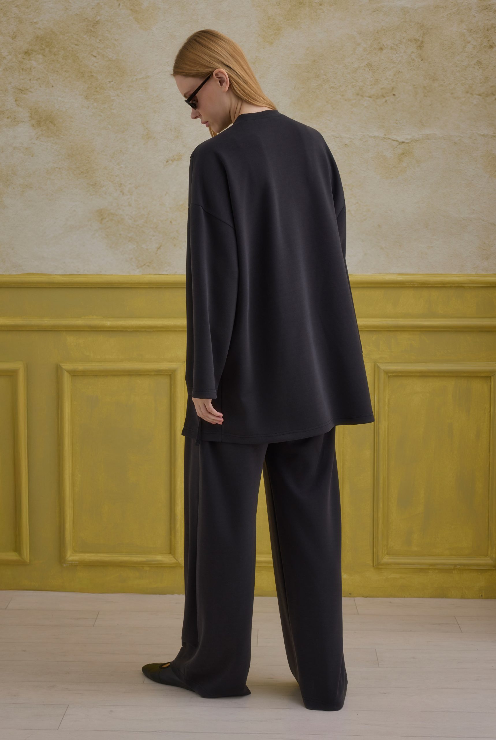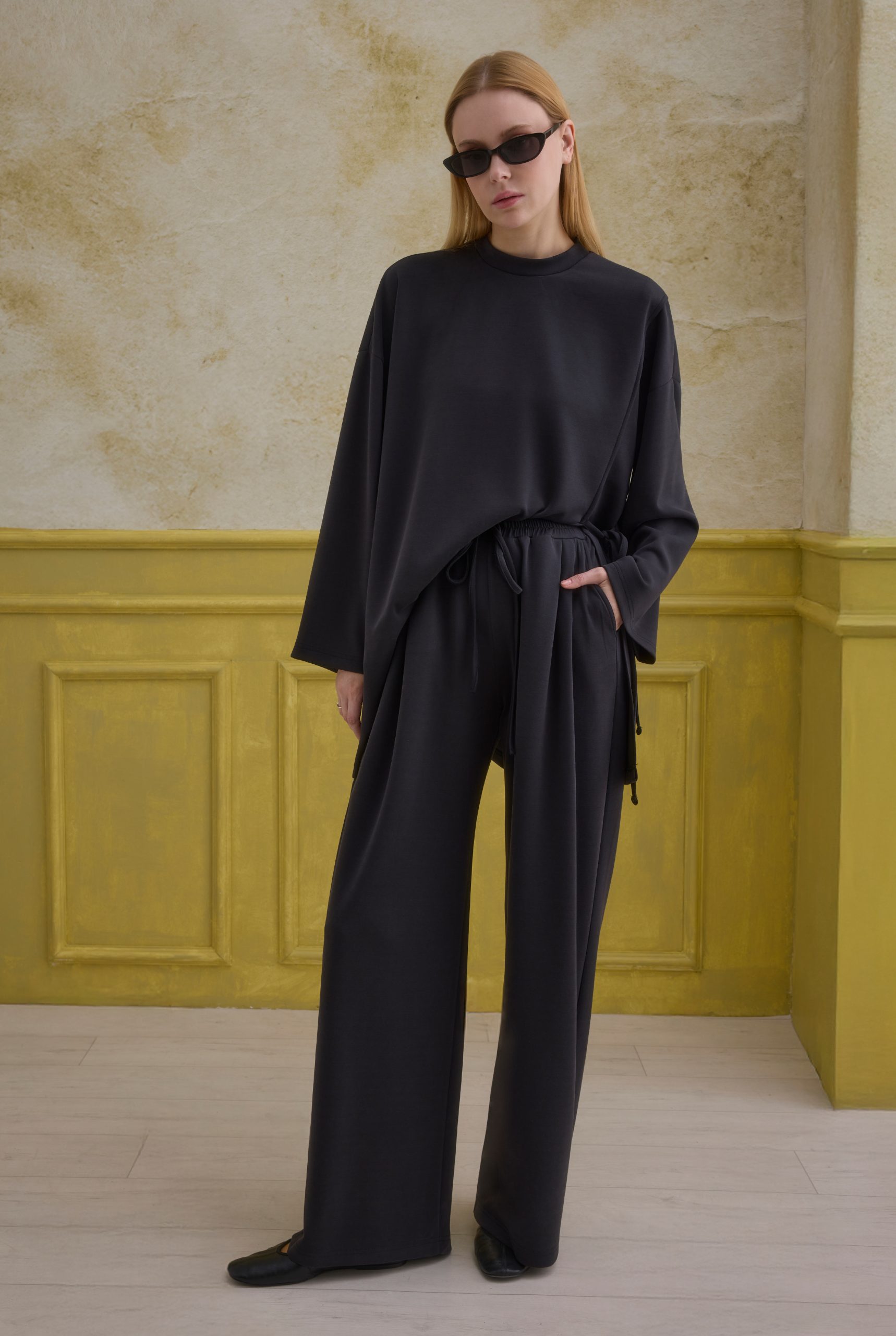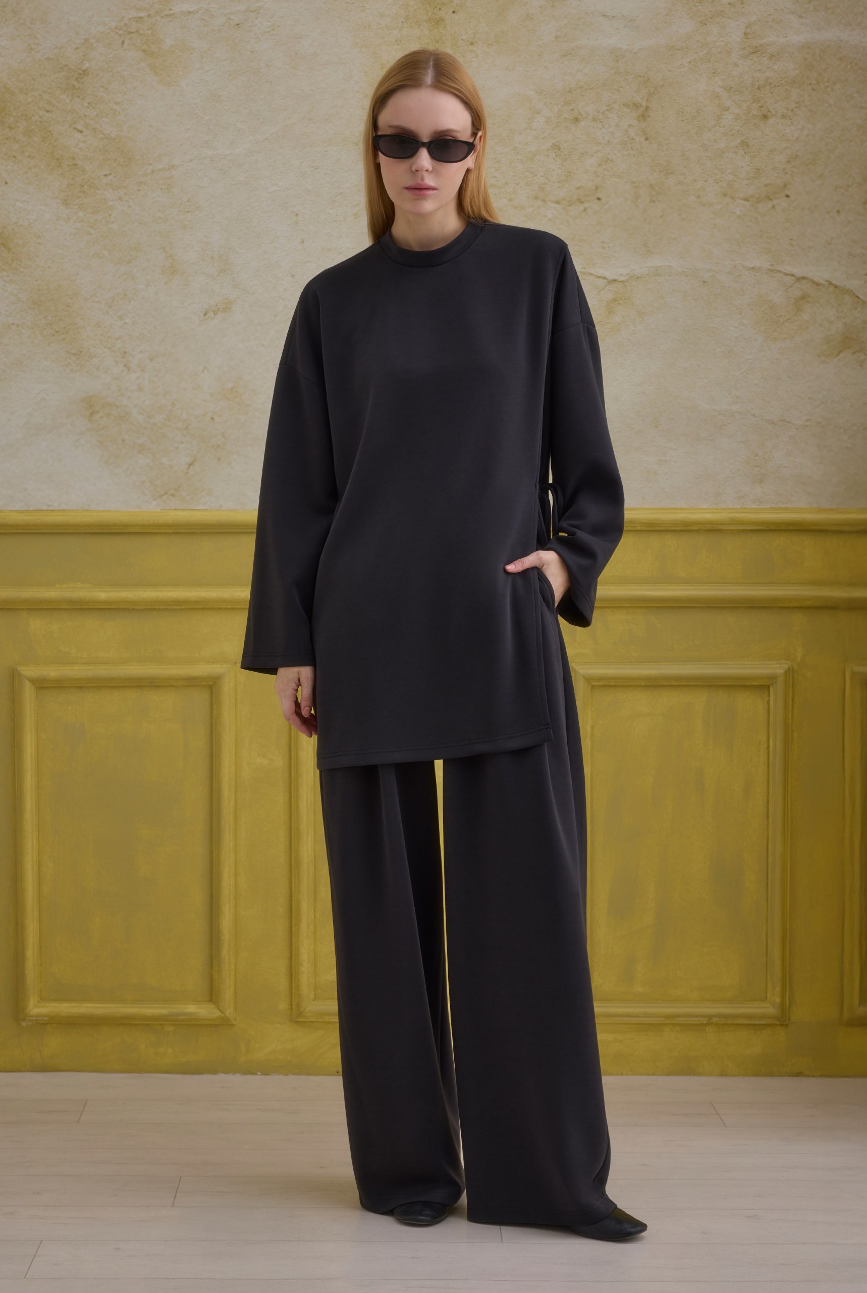 تضيف تفاصيل الربط لمسة أنيقة وخفية للطقم، بينما توفر البنطلون المطوي المريح حرية الحركة والأناقة. يصبح خيارًا أساسيًا للتركيبات اليومية والرياضية. إذا رغبت، يمكن تثبيت الفتحة الجانبية بالخياطة اليدوية.