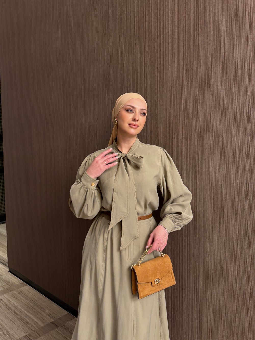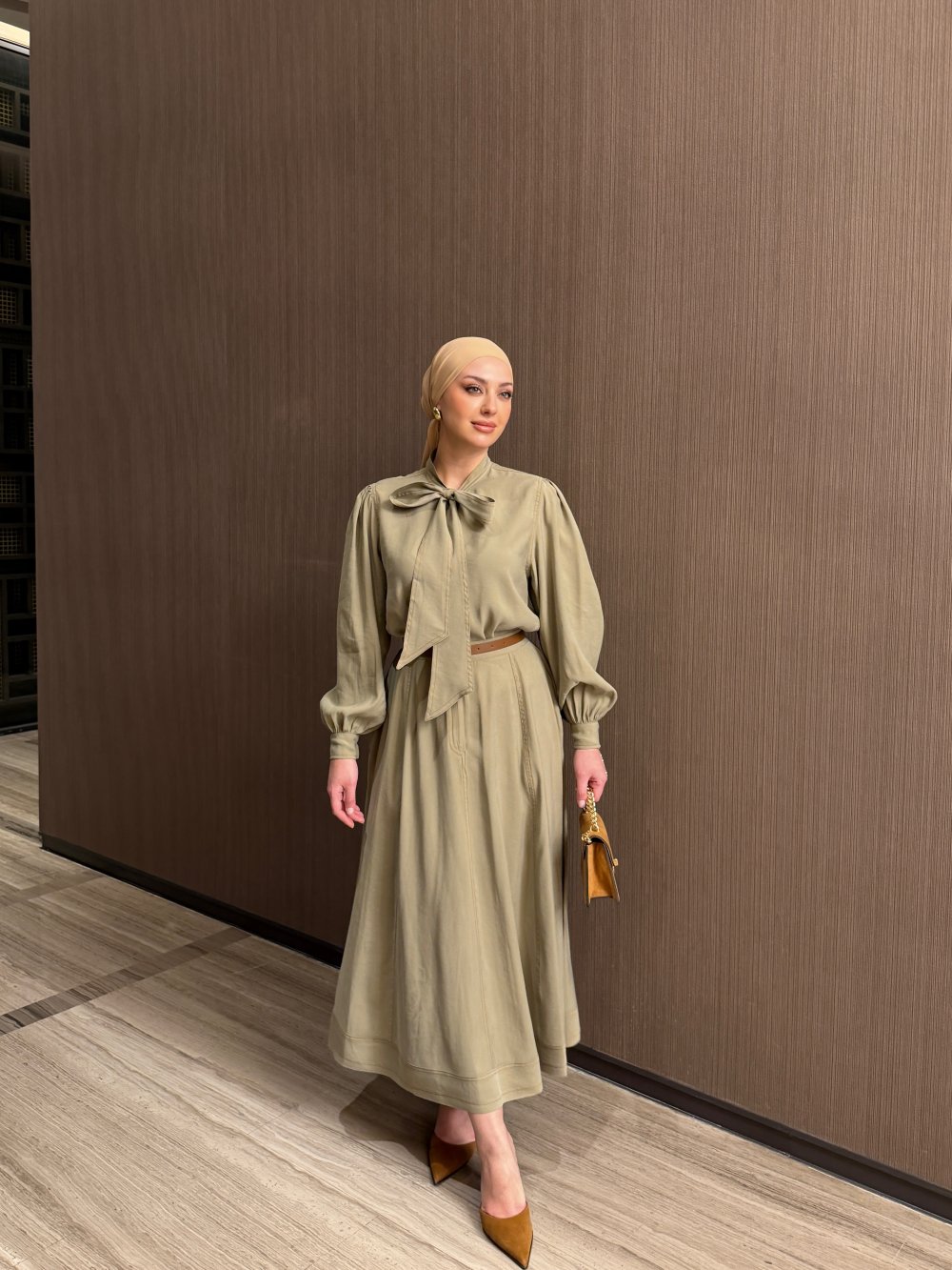 هذا الطقم مصنوع من قماش الدنيم عالي الجودة من الفئة الأولى. يتميز الجزء العلوي بتفاصيل أنيقة على شكل ربطة. تحتوي التنورة على إغلاق بالأزرار والسحاب وتأتي بحزام قابل للتعديل. القياسات: الكتف 39 سم، الصدر 52 سم، طول الجاكيت 53 سم، محيط خصر التنورة 36 سم، طول التنورة 90 سم.