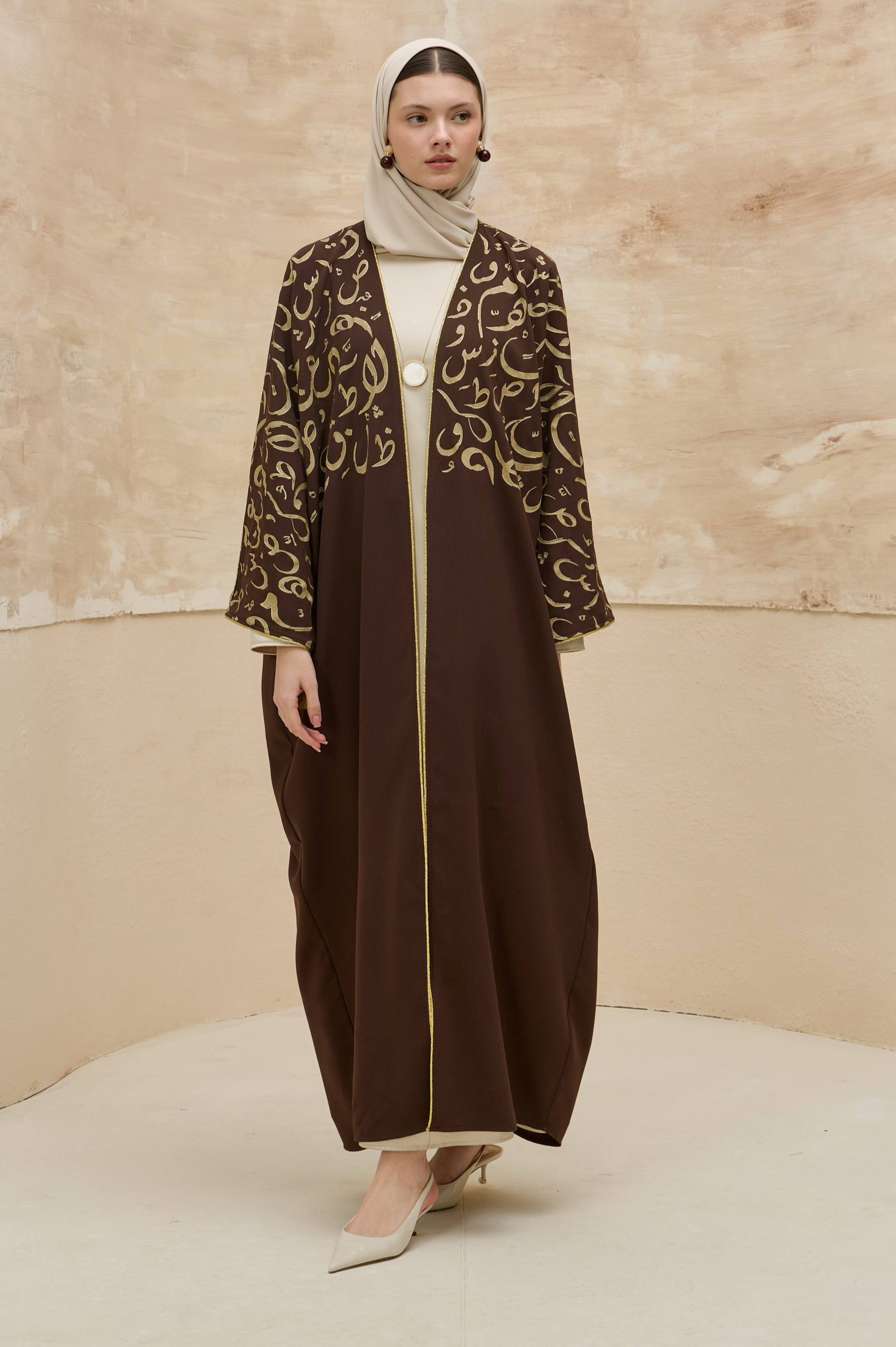 تم تصميم هذه العباءة المميزة بتفاصيل حروف عربية ذهبية، لتقدّم مظهرًا أنيقًا بفضل قماش الكريب المتدفق والأنيق. بتصميمها المستوحى من الشرق، تشكّل إطلالة ملفتة لكل من المناسبات الخاصة والتركيبات الأنيقة.