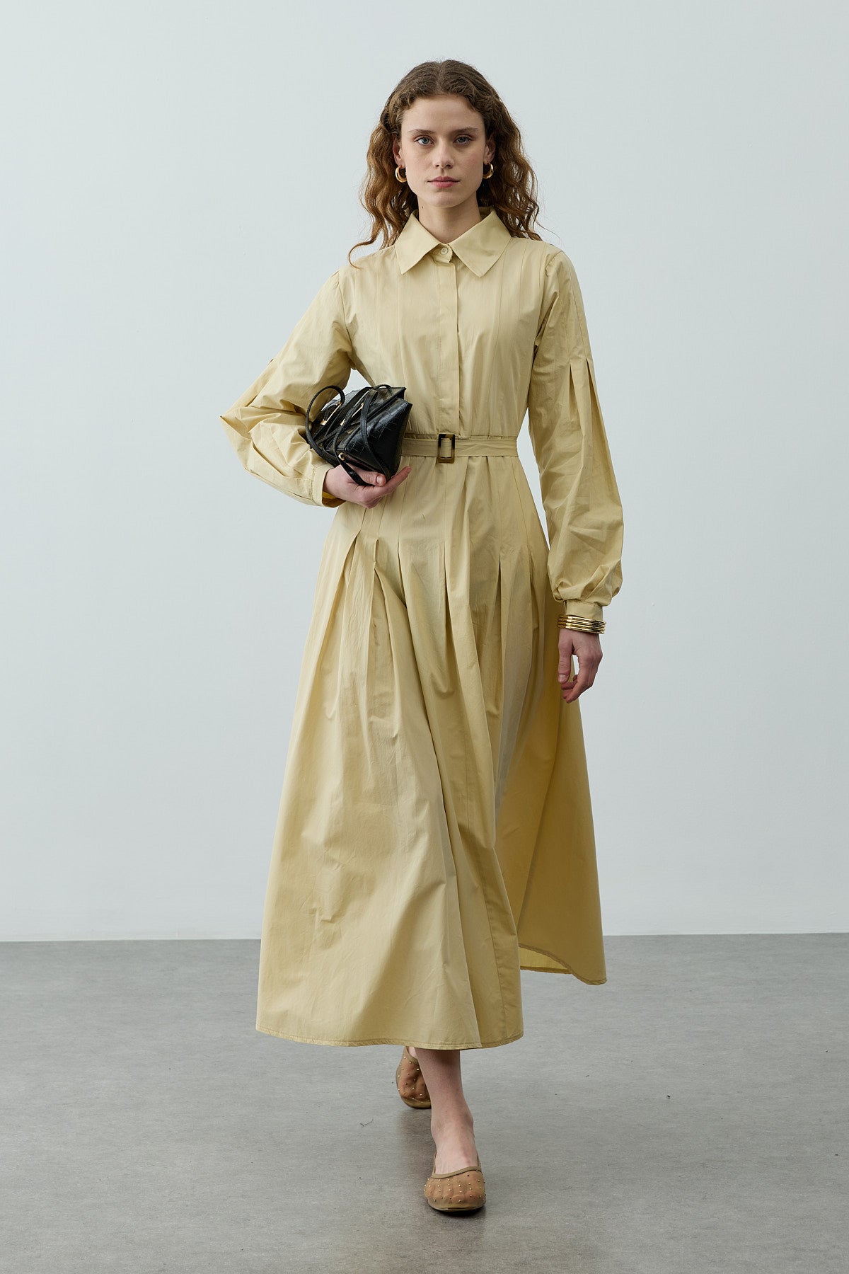 مصنوعة من قماش منسوج بنسبة 100% قطن، تتميز بأكمام طويلة ذات طيات مجمعة، ياقة قميص، تفاصيل حزام رقيقة، خصر مطوي، وطول ماكسي.