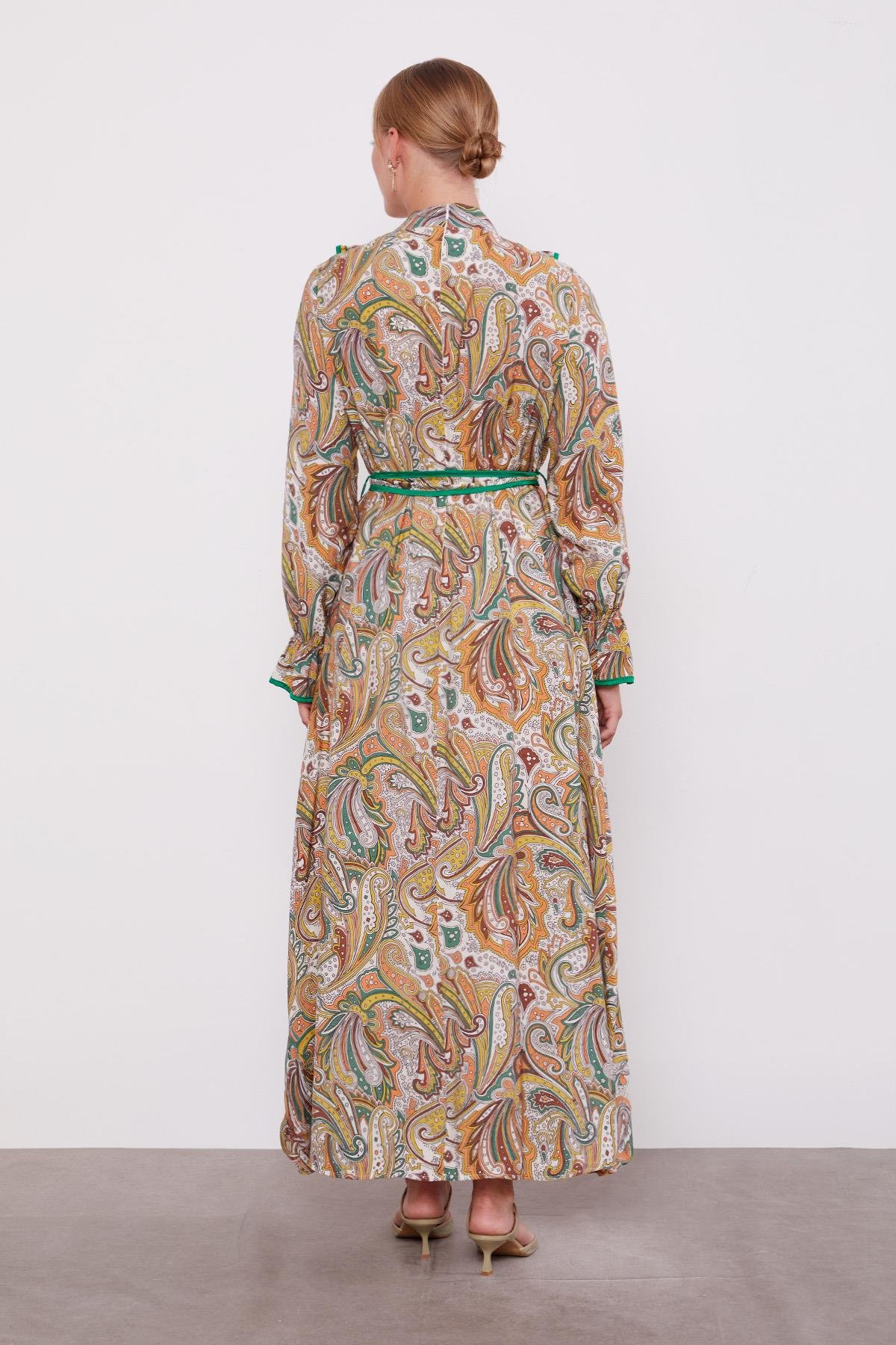 فستان أخضر مزخرف بتفاصيل كشكشة ورسومات عرقية